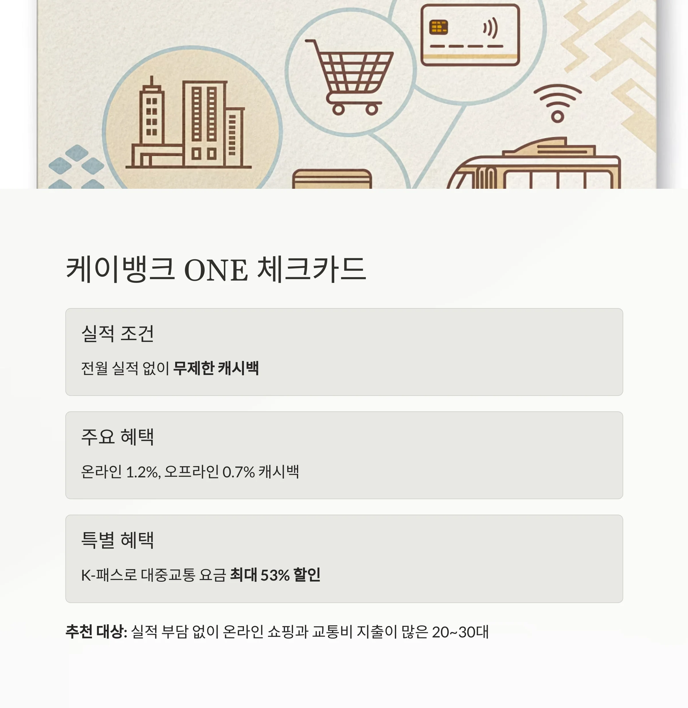 실적 조건 없는 무제한 캐시백 케이뱅크 ONE 체크카드 전월 실적 없이 온라인/오프라인 혜택 누적 가능