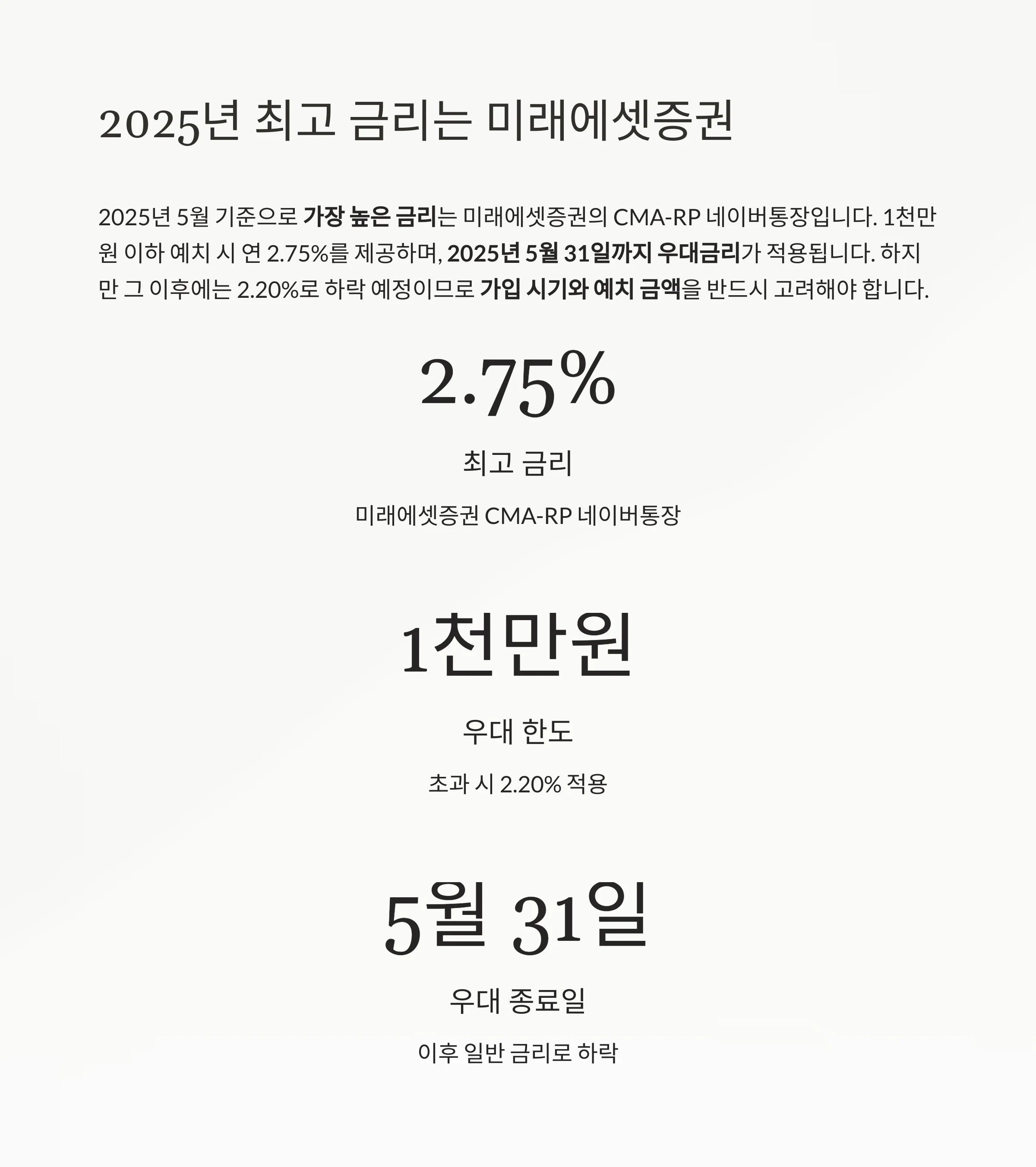 2025년 5월 기준으로 가장 높은 금리는 미래에셋증권의 CMA-RP 네이버통장입니다.