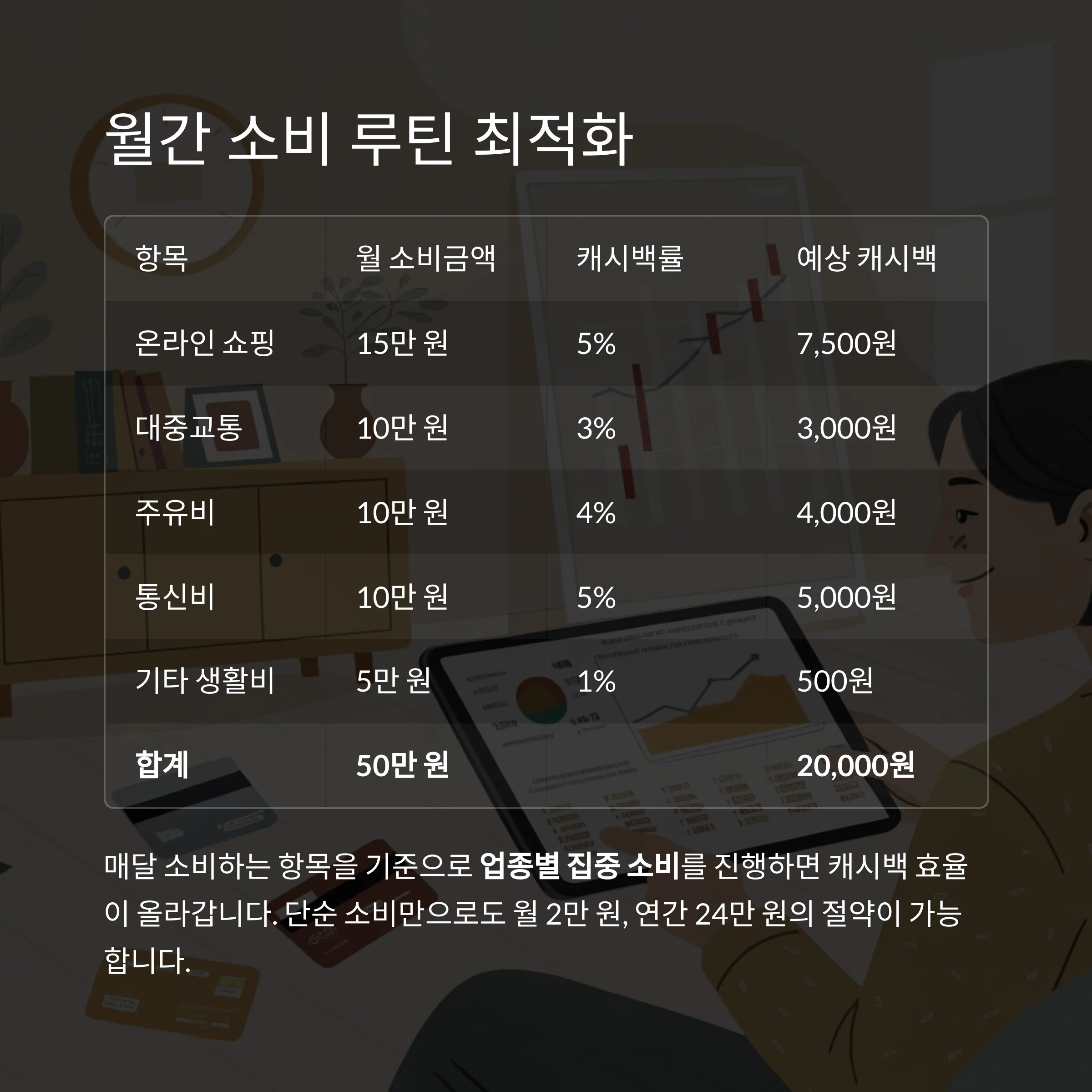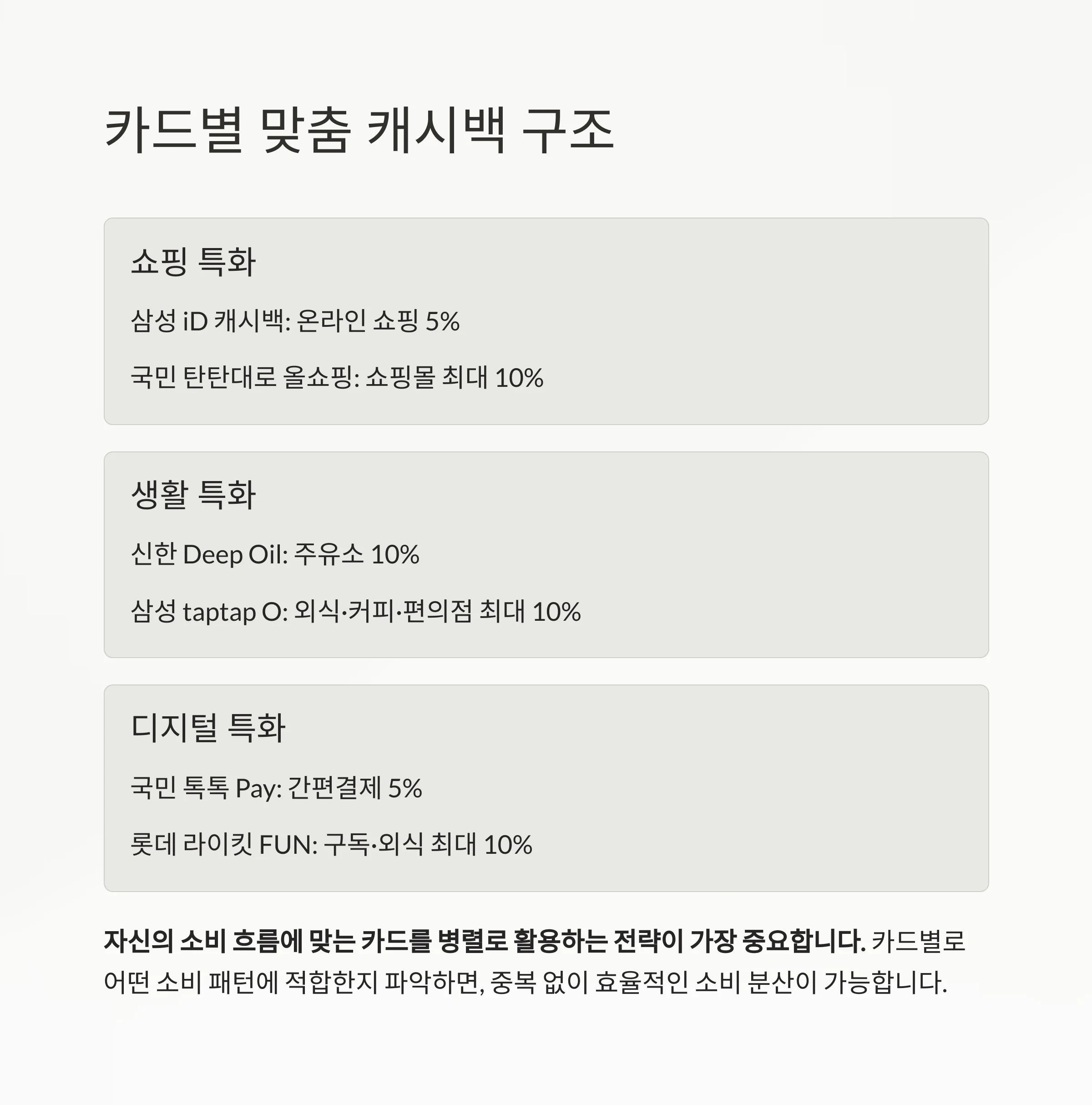 | 업종별 카드 병행 | 쇼핑, 주유, 교통 등 용도별 최적 카드 선택 |