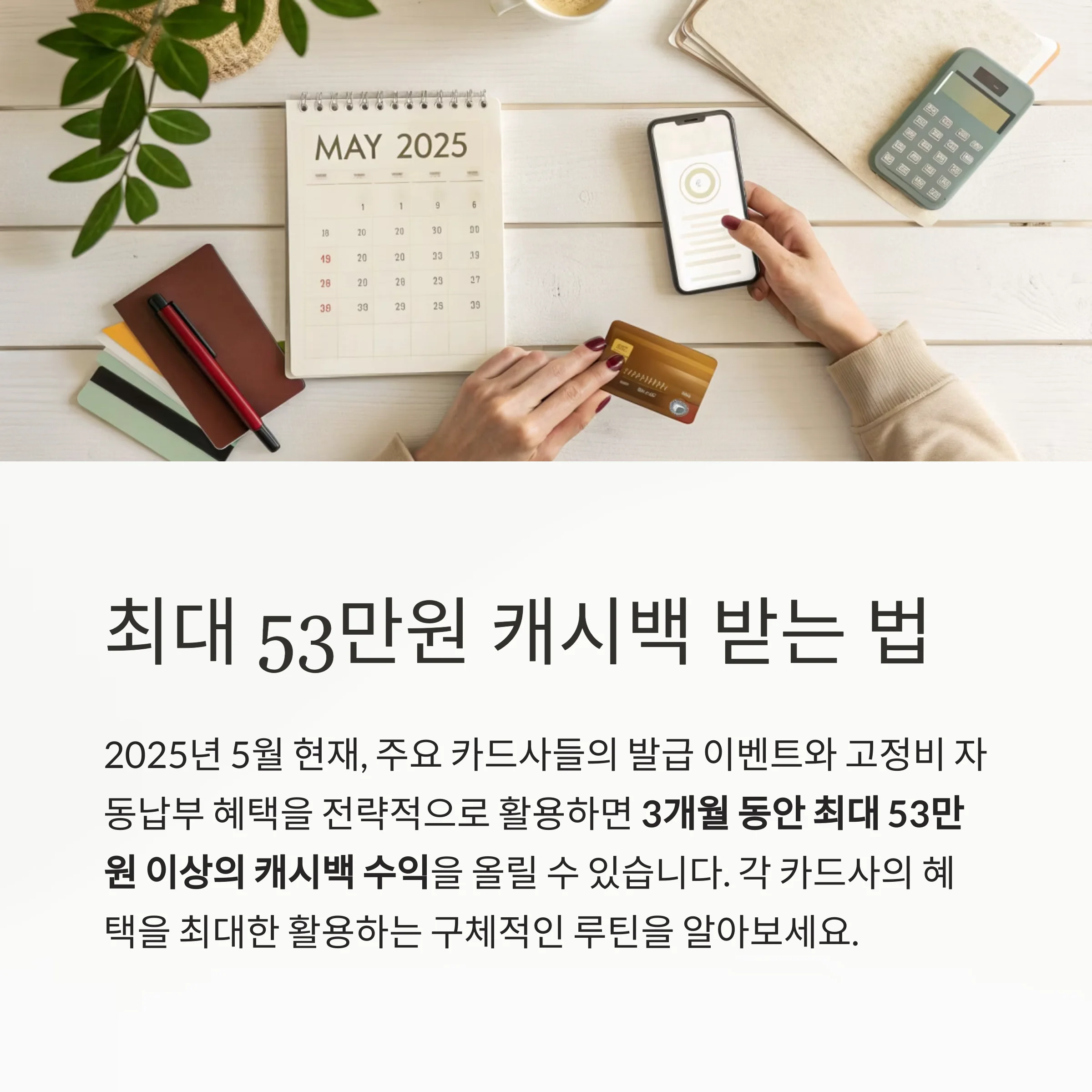 2025년 5월 기준, 각 카드사의 신규 발급 이벤트를 활용하면 최대 수십만 원의 캐시백을 받을 수 있습니다.