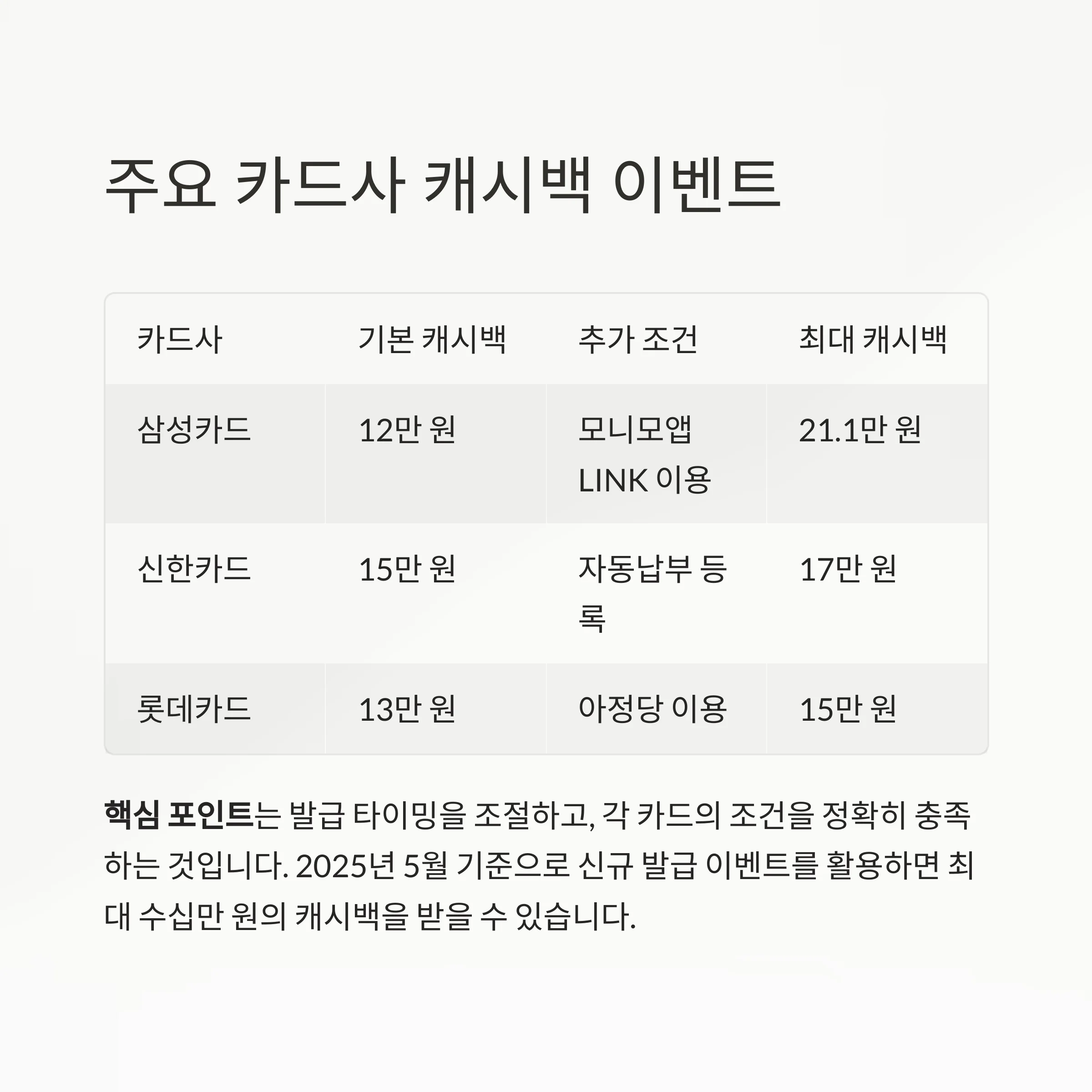 2025년 5월 기준, 각 카드사의 신규 발급 이벤트를 활용하면 최대 수십만 원의 캐시백을 받을 수 있습니다.