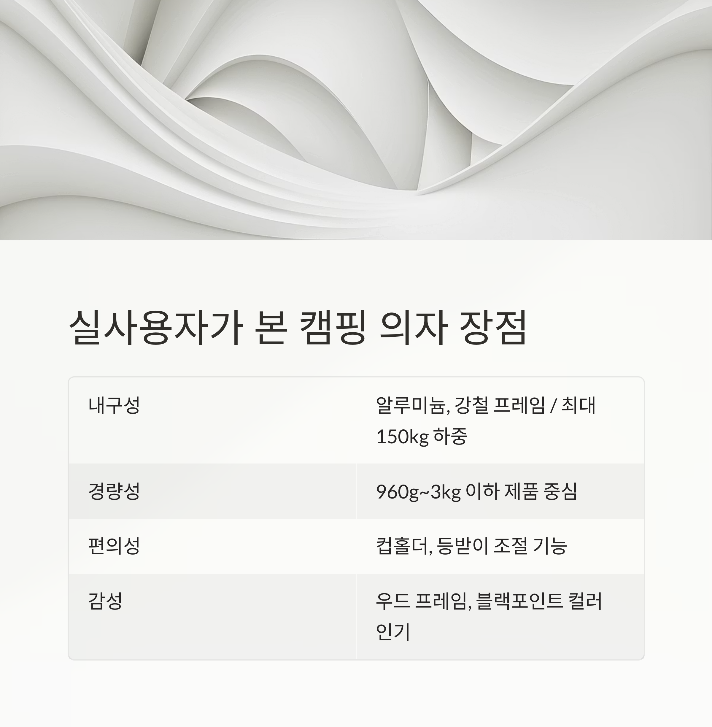 - 핵심 특징: 접이식, 세트 구성, 알루미늄 프레임