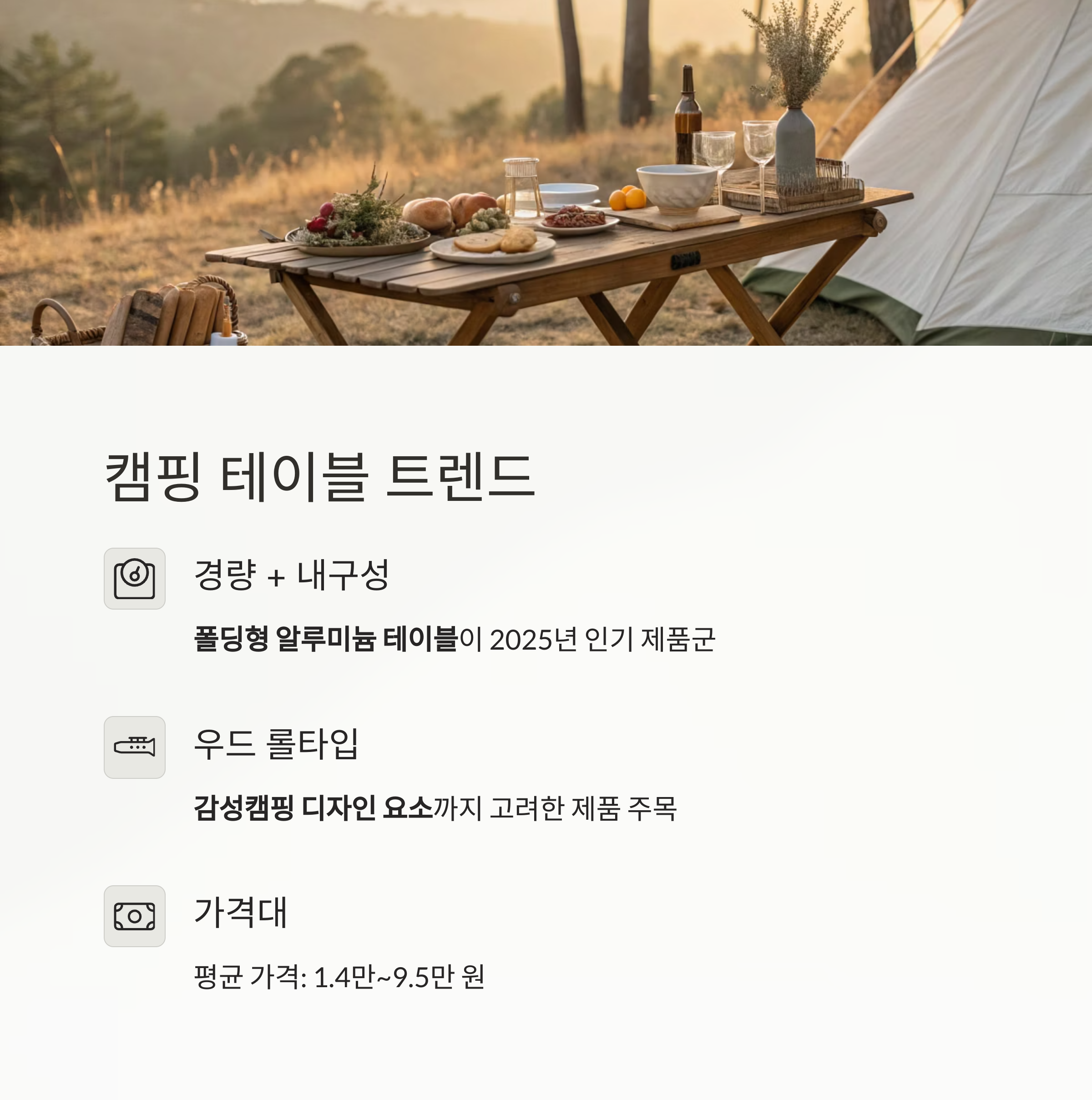 특히 폴딩형 알루미늄 테이블과 우드 롤타입 테이블이 2025년 인기 제품군으로 자리잡았습니다.