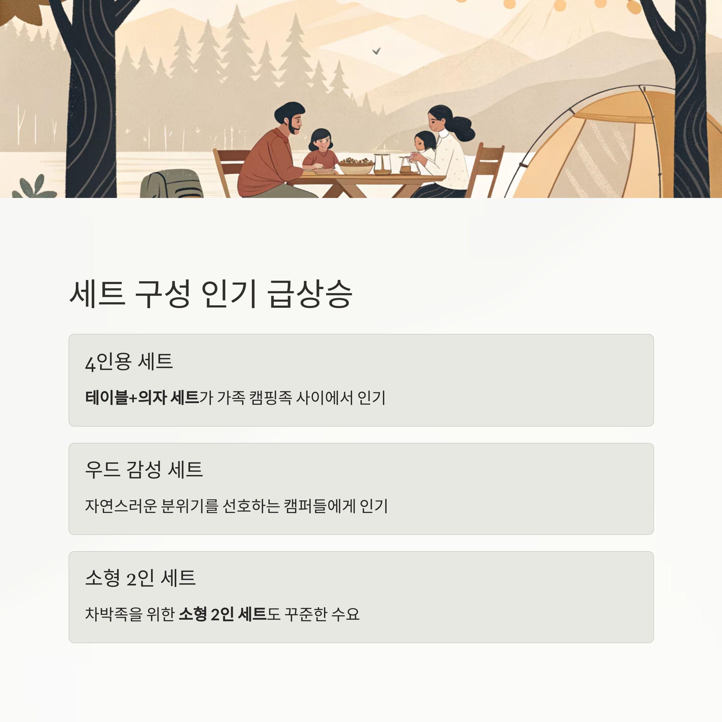 특히 4인용 테이블+의자 세트나 우드 감성 세트가 가족 캠핑족 사이에서 인기를 얻고 있으며,