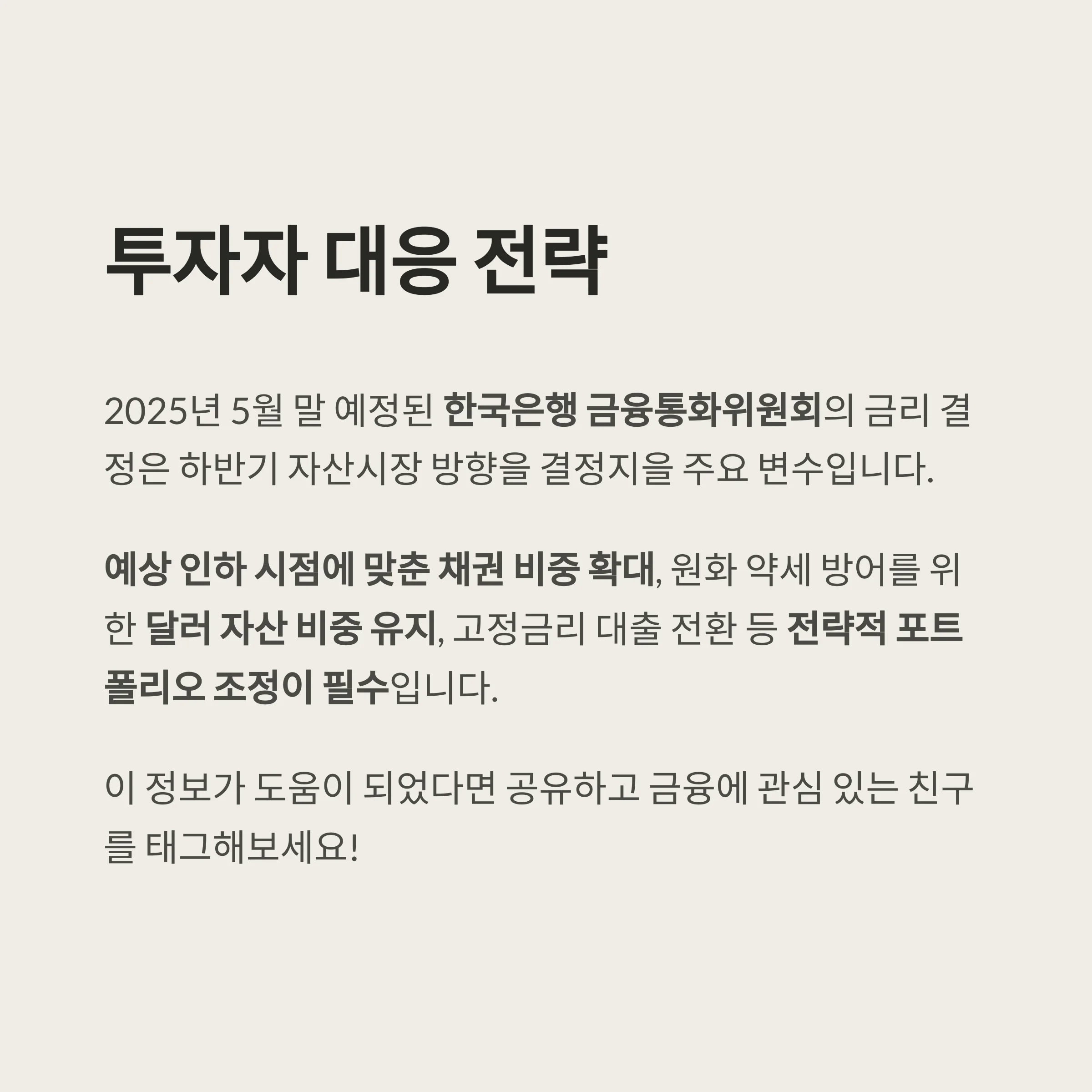 예상 인하 시점에 맞춘 채권 비중 확대, 원화 약세를 방어하기 위한 달러 자산 비중 유지, 고정금리 대출 전환 등 전략적 포트폴리오 조정이 필수입니다.