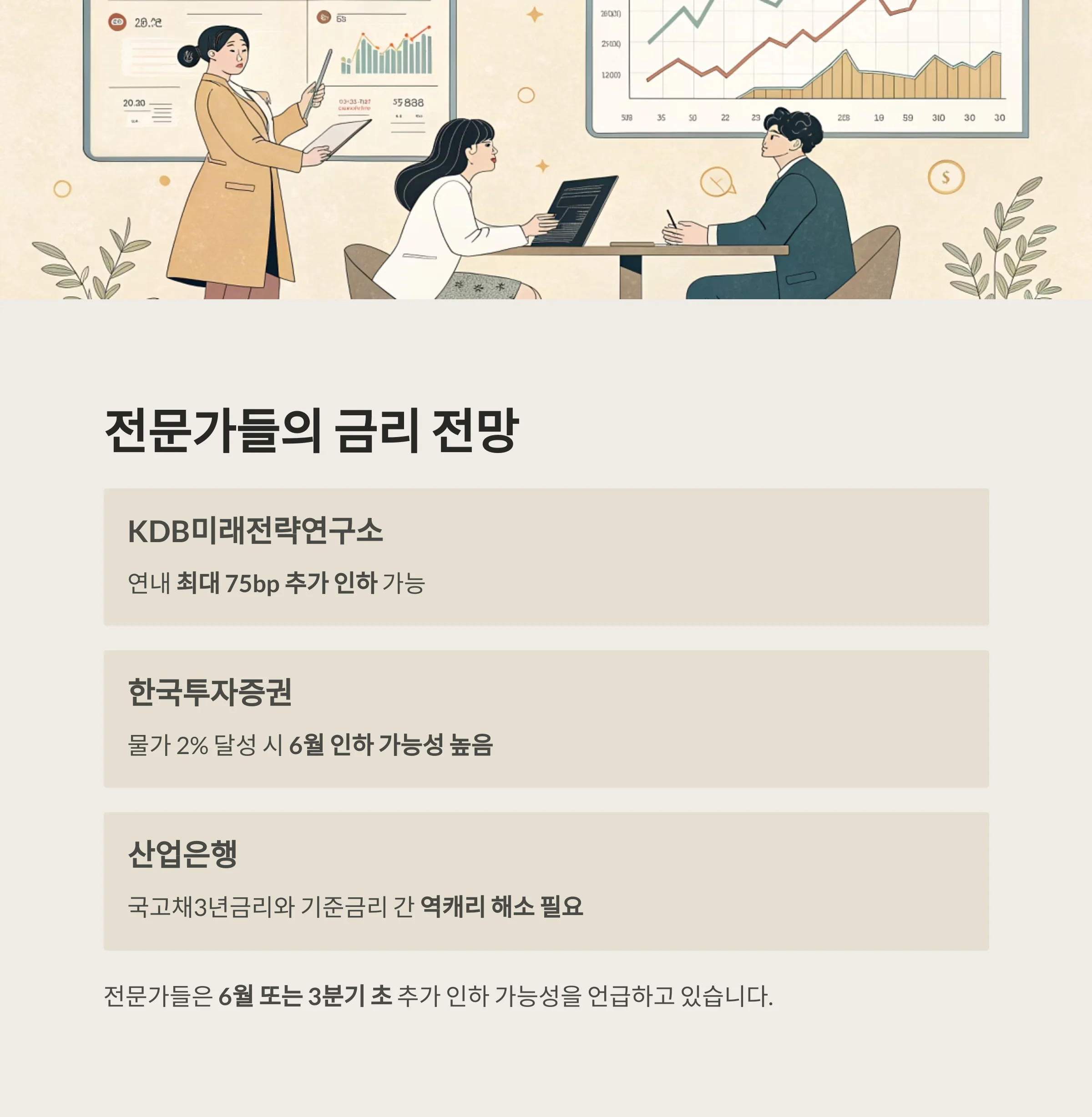 전문가들은 금리 추가 인하 가능성을 다수 언급하고 있으며, 시점은 6월 또는 3분기 초가 될 것이라는 의견이 많습니다.