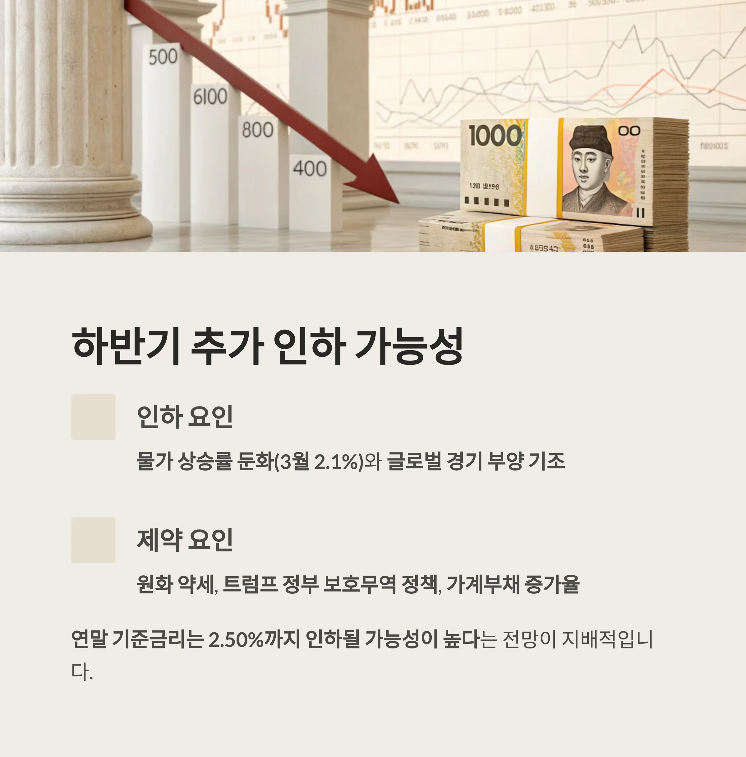다만, 원화 약세와 트럼프 정부의 보호무역 정책, 가계부채 증가율은 인하 속도를 늦출 수 있는 변수입니다.