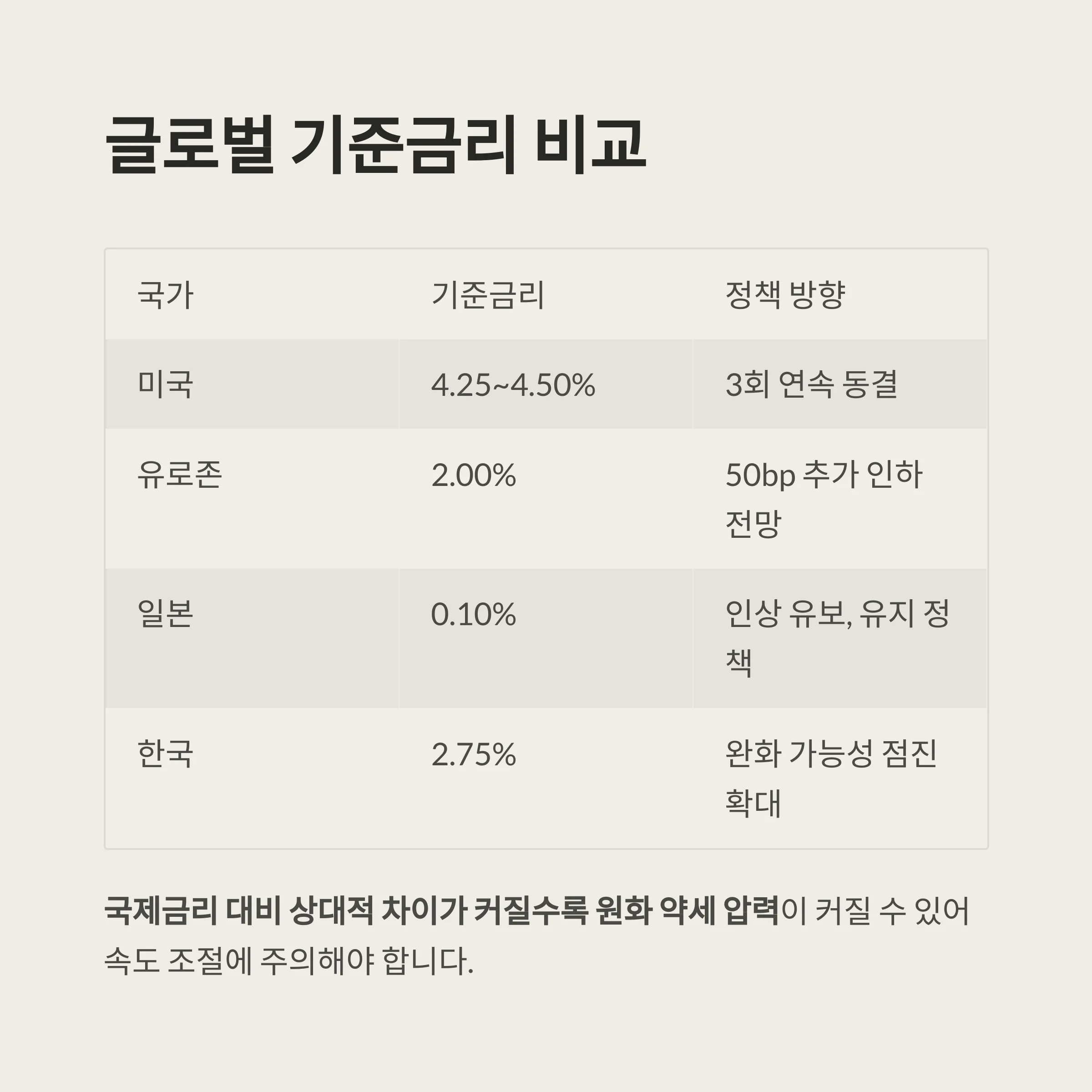 미국은 세 차례 연속 동결, 유로존은 인하 기조, 일본은 초저금리 정책을 유지 중입니다.