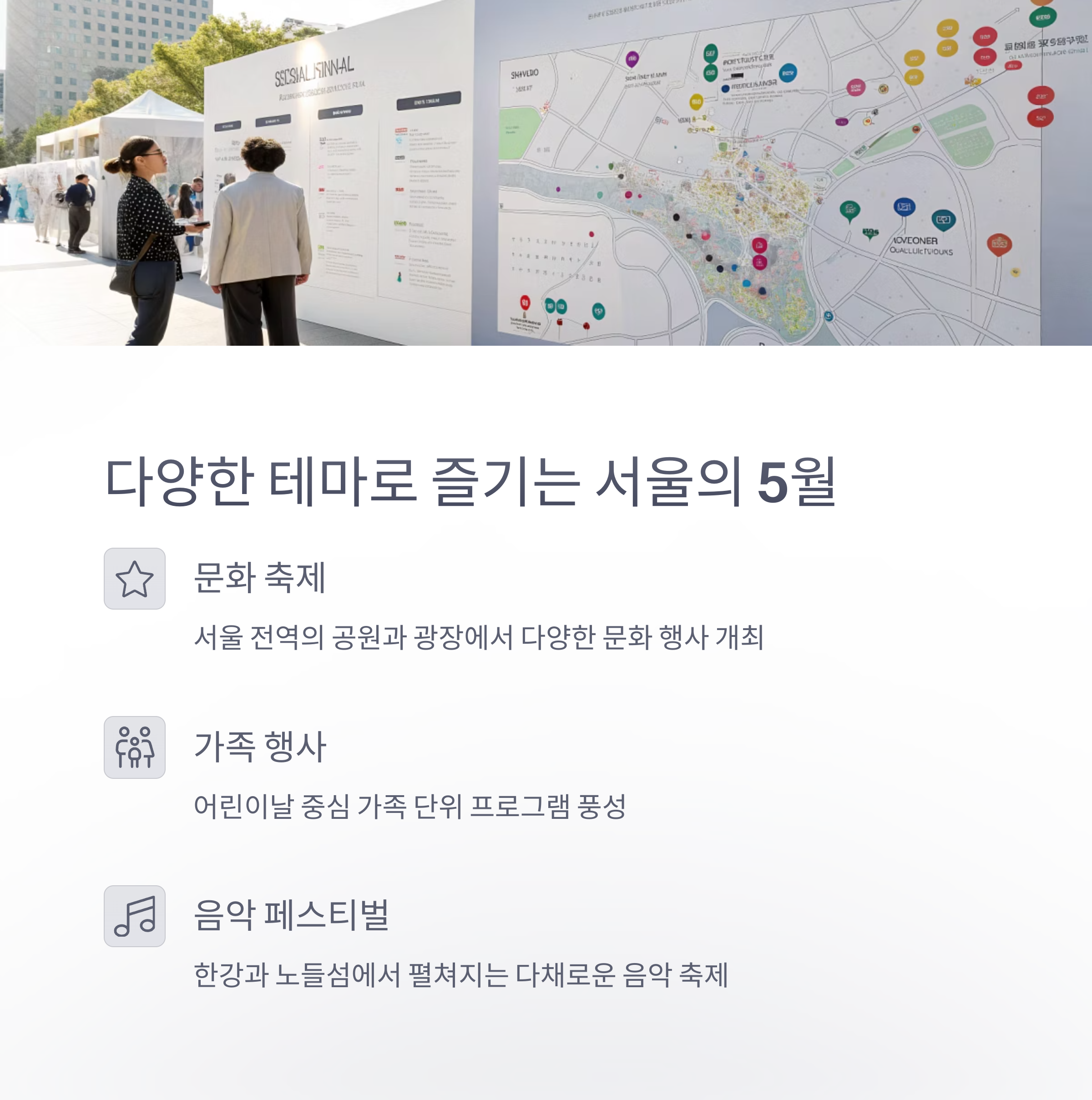 2025년 5월 서울에서는 문화, 자연, 가족, 국제 교류, 음악 등 다양한 테마의 축제가