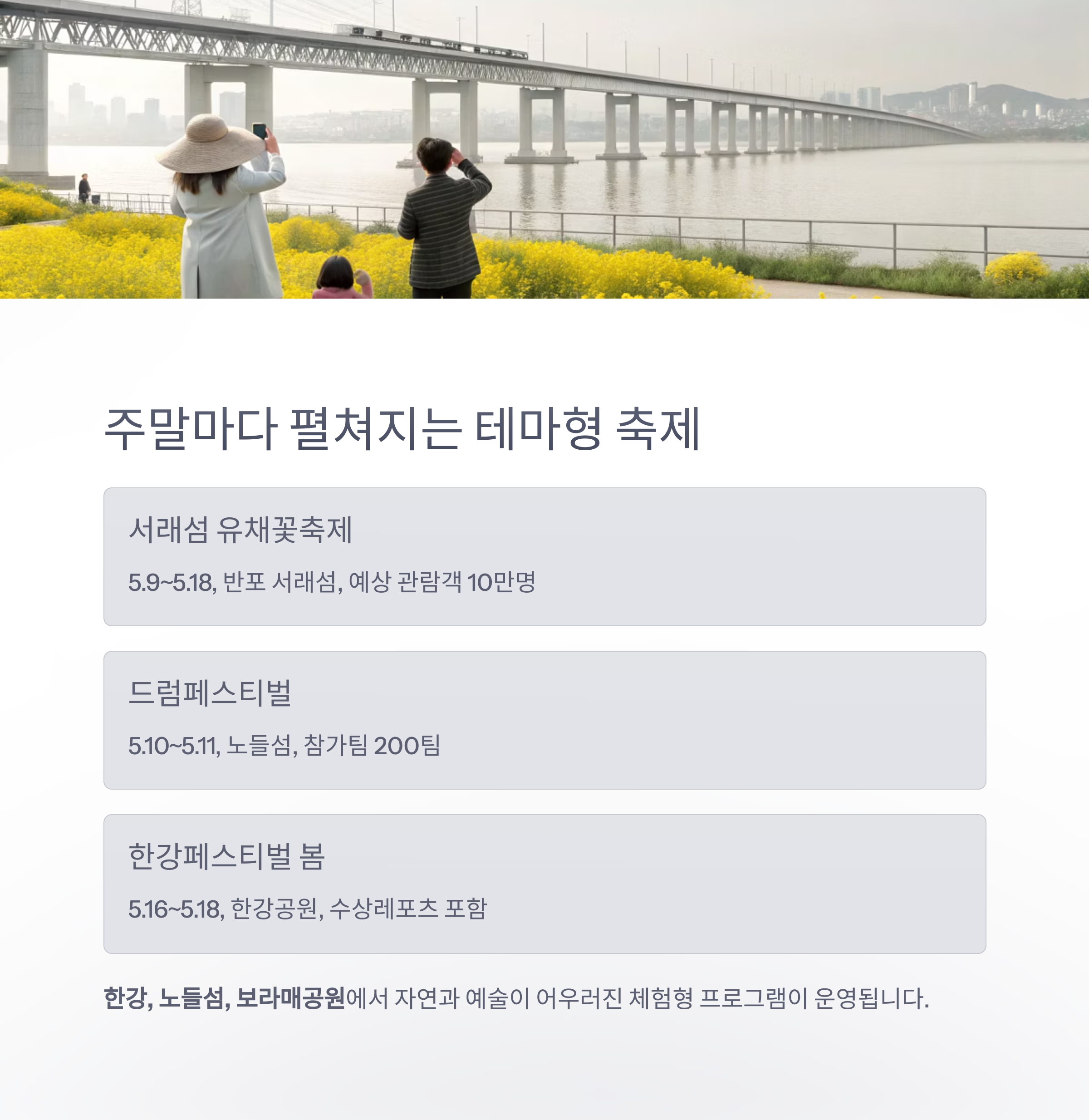 | 5.9~5.18 | 서래섬 유채꽃축제 | 반포 서래섬 | 10만명 예상 |