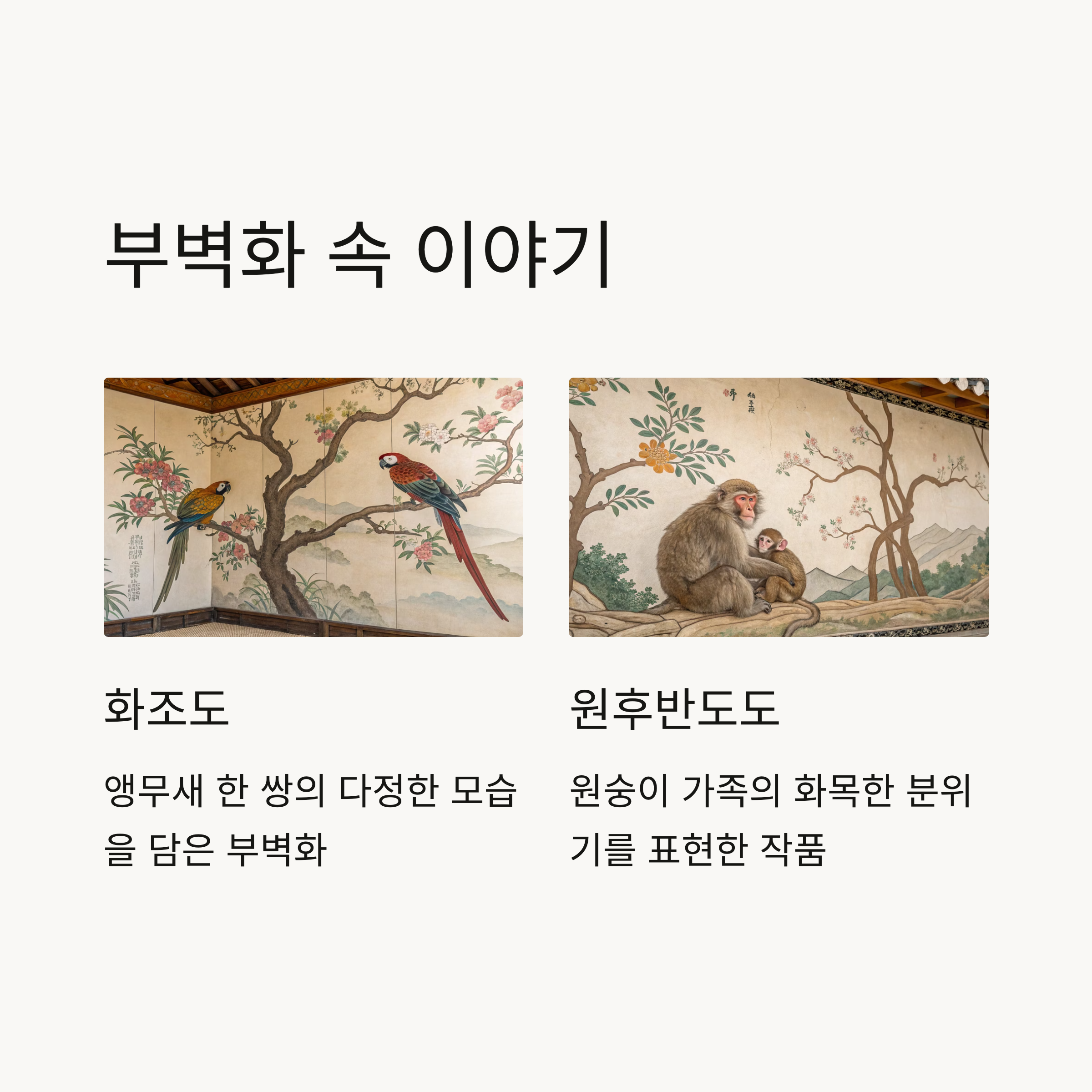 - "화조도"는 앵무새 한 쌍이 나란히 있는 평화로운 풍경