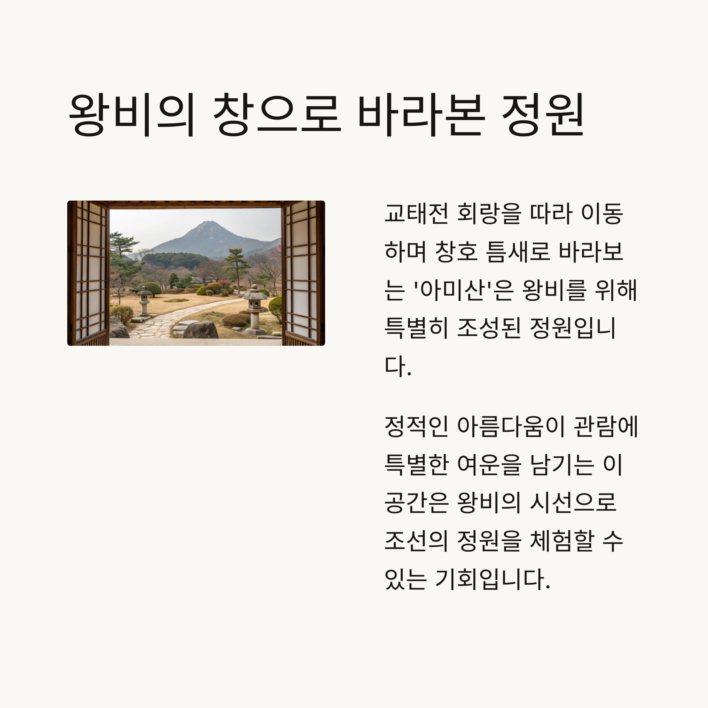 "왕비의 창으로 바라본 조선의 정원"이라는 느낌을 전해주는 공간입니다.