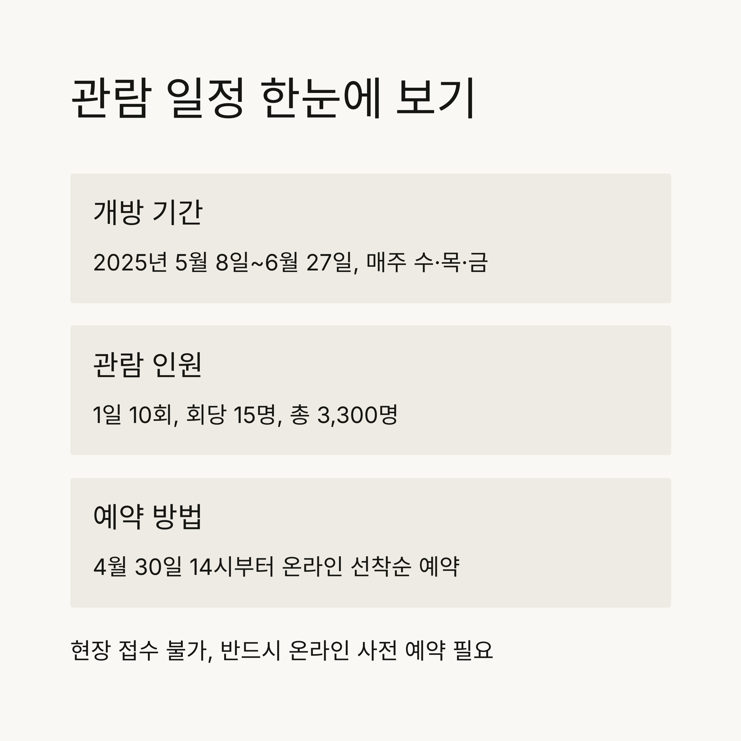 다음은 관람 가능 일정과 예약 조건을 정리한 표입니다.