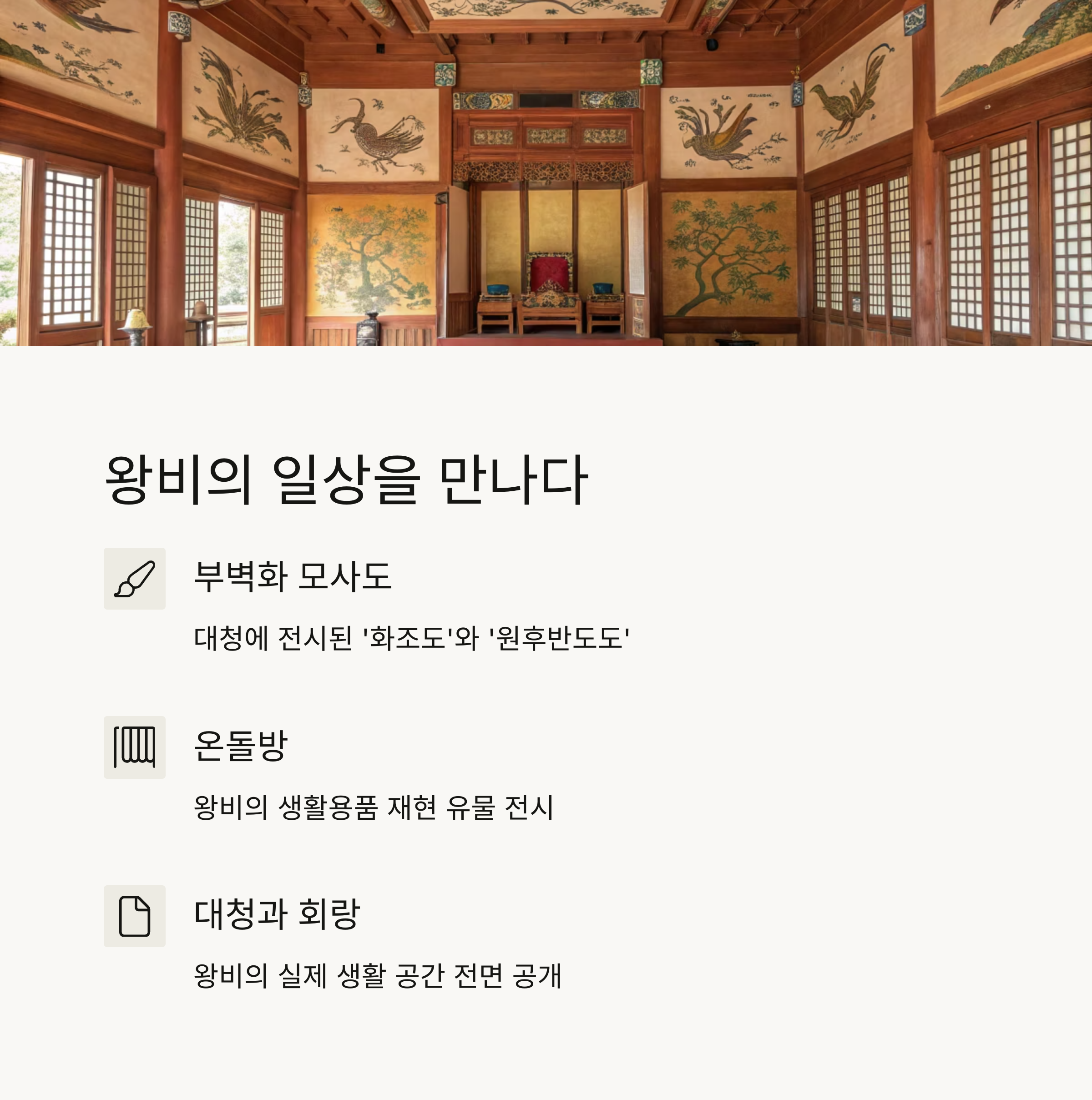 왕비가 생활하던 실제 공간인 대청, 온돌방, 회랑이 전면 공개되며