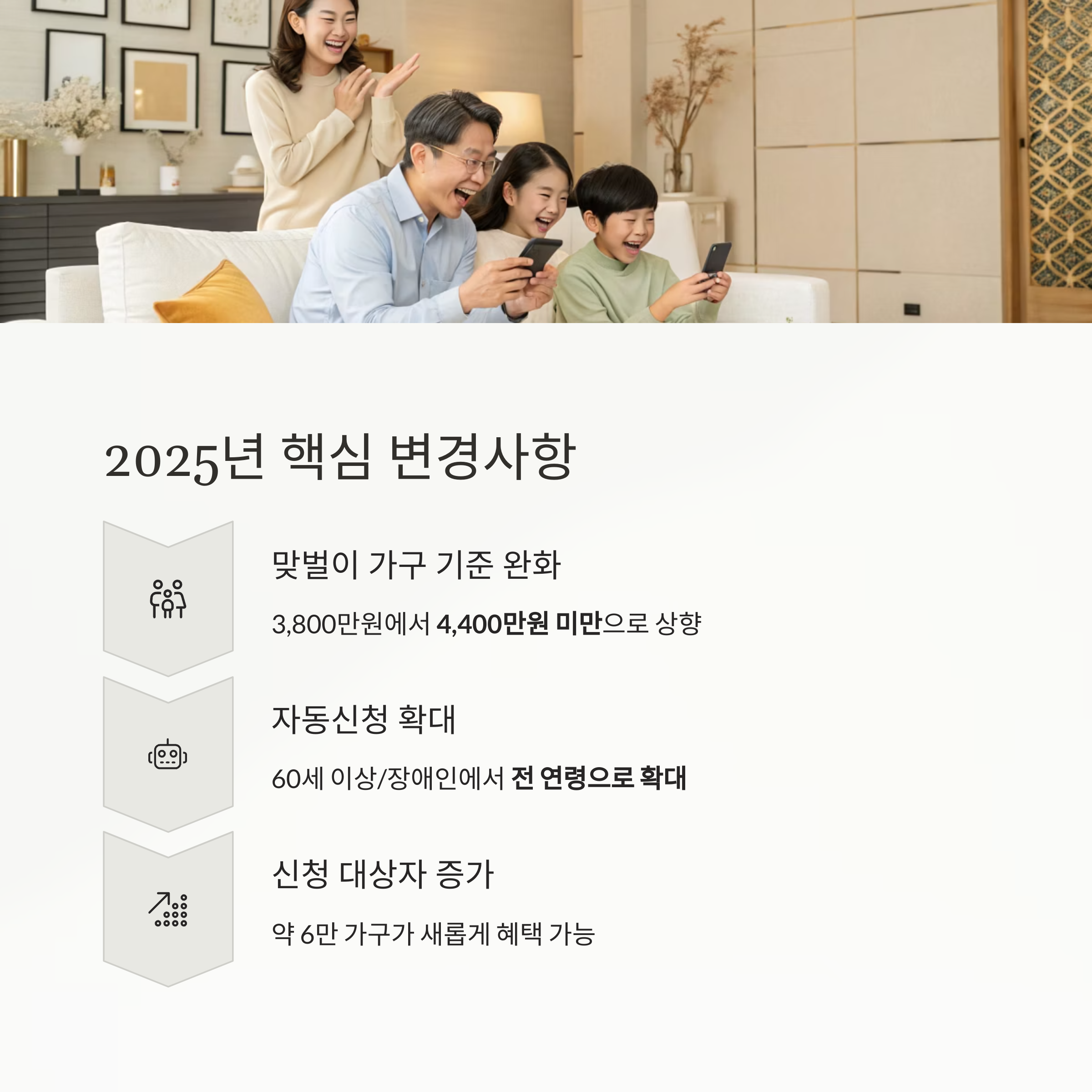 2025년부터는 소득 기준과 신청 방식에 중요한 변화가 있어 많은 가구가 새롭게 수혜를 받을 수 있습니다.