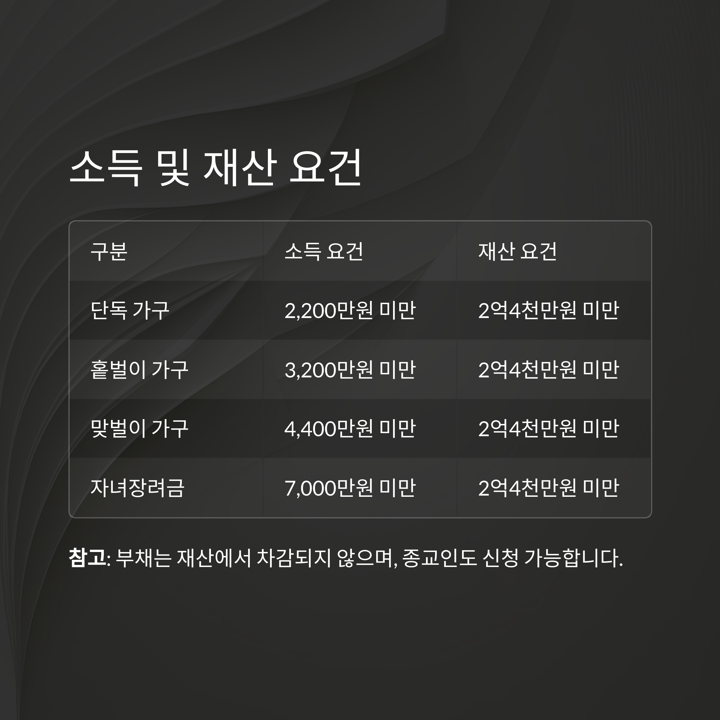 구분 소득 요건 (2025년 기준) 재산 요건 (2024.6.1 기준) 비고