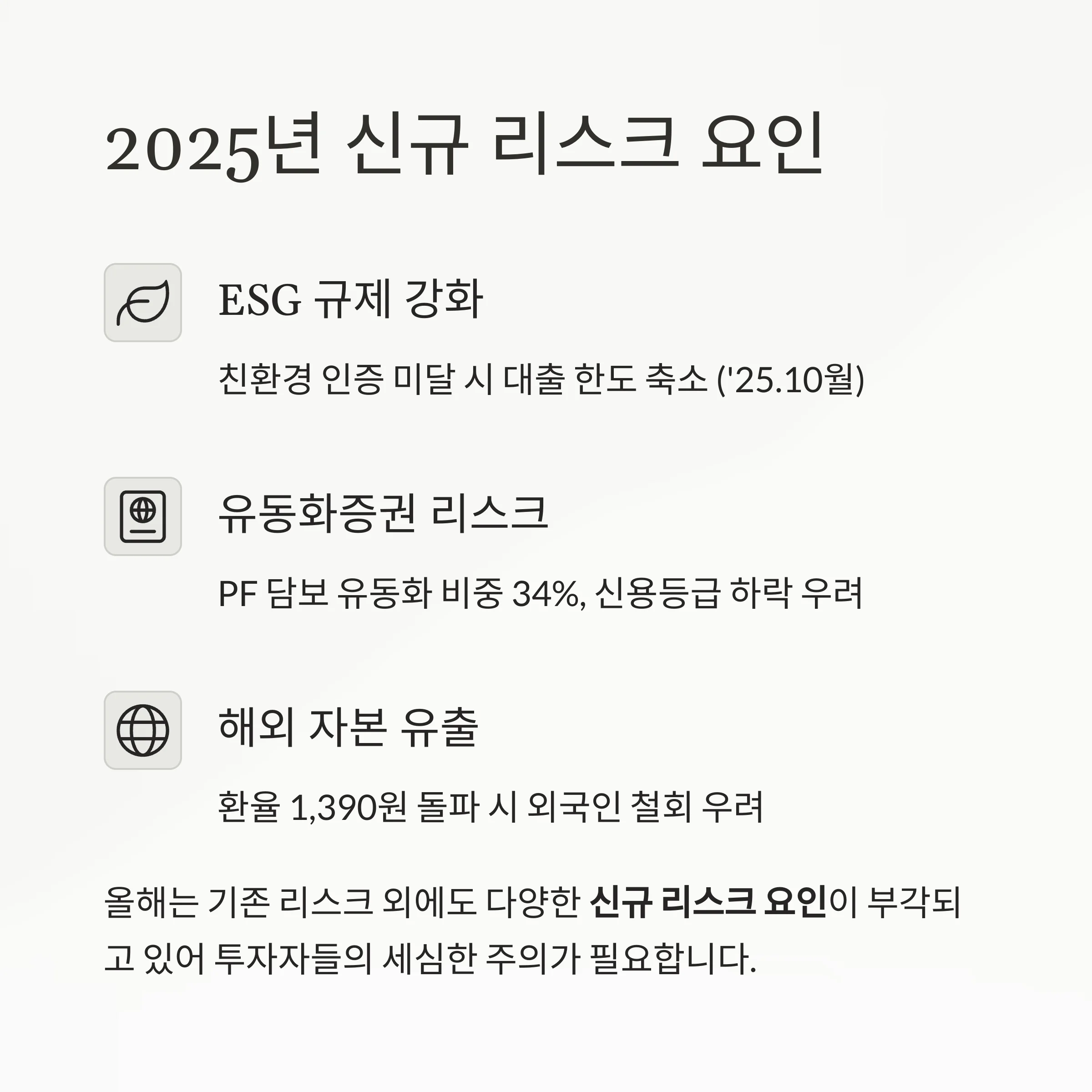 | ESG 규제 강화 | 친환경 인증 미달 시 대출 한도 축소 (‘25.10월) |