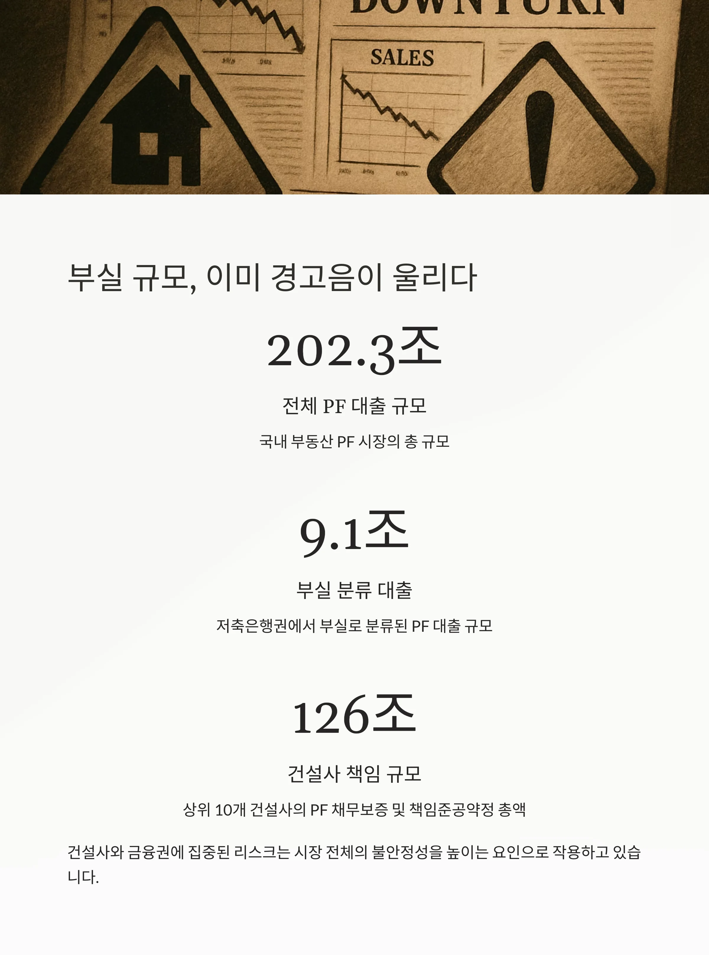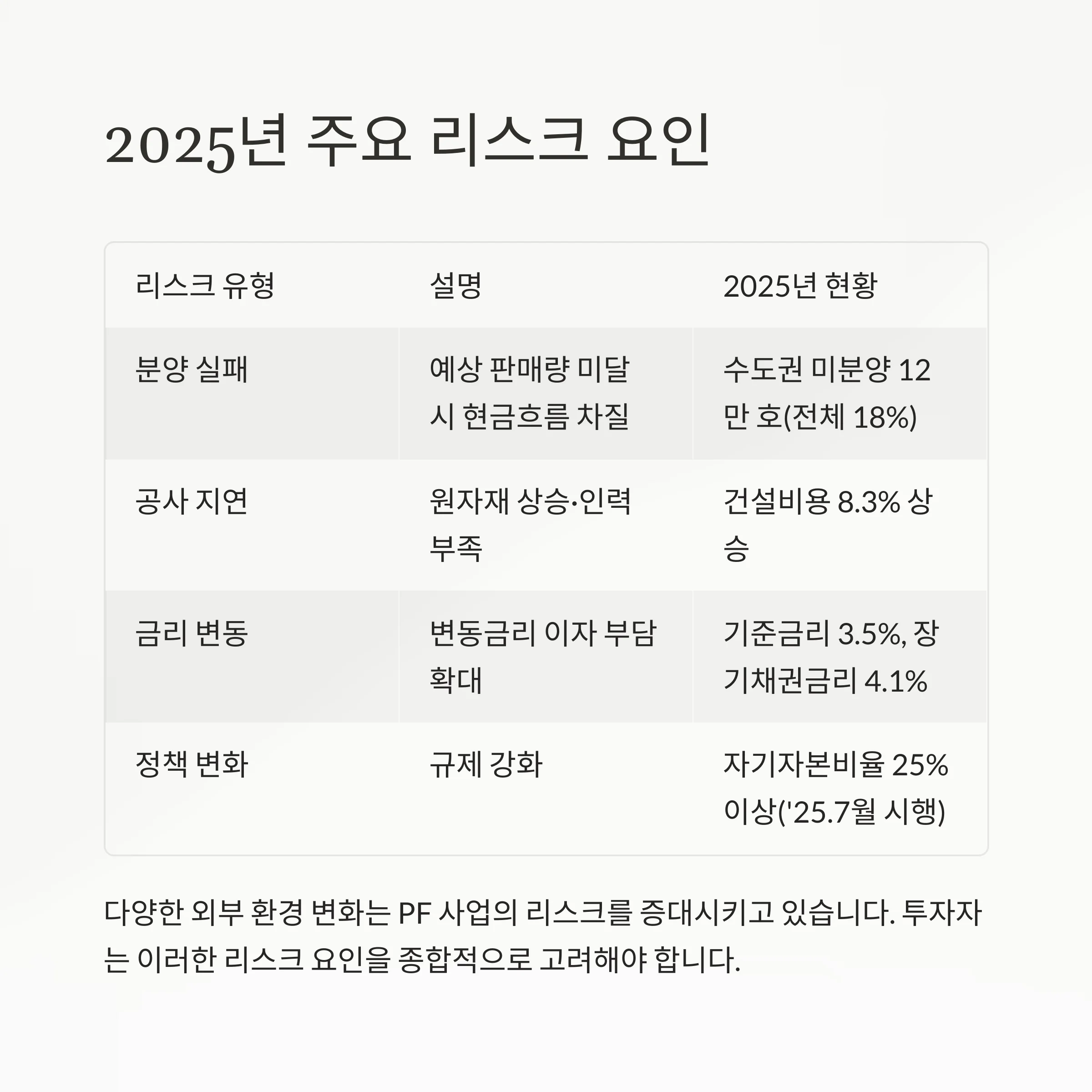 | 분양 실패 | 예상 판매량 미달 시 현금흐름 차질 | 수도권 미분양 12만 호(전체 18%) |