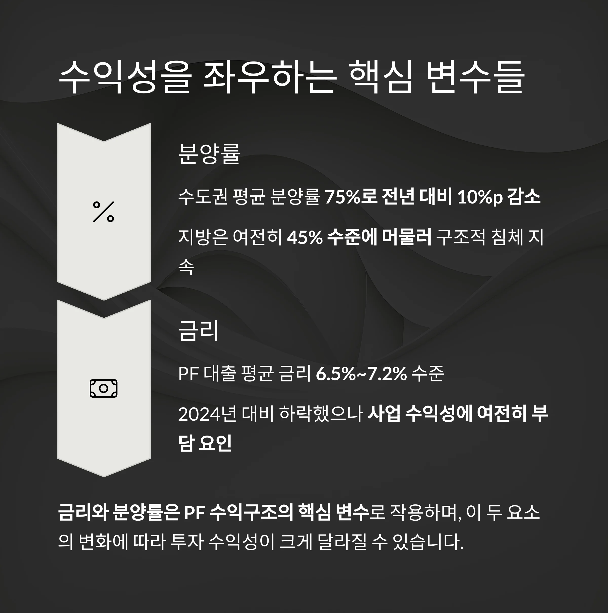금리와 분양률은 PF 수익구조의 핵심 변수로 작용합니다.