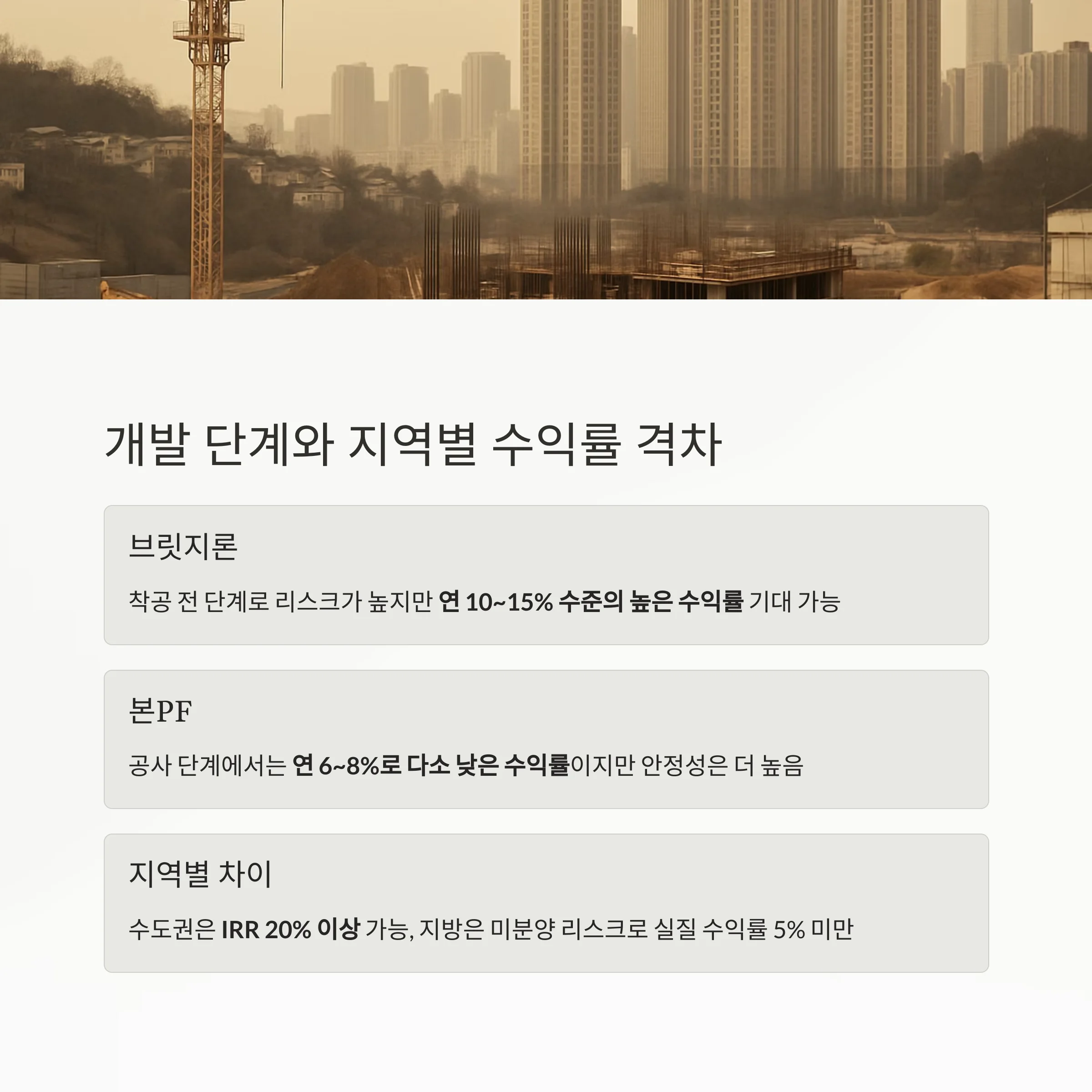 반면 공사 단계의 본PF는 연 6~8%로 다소 낮은 수익률을 보이지만 안정성은 더 높습니다.
