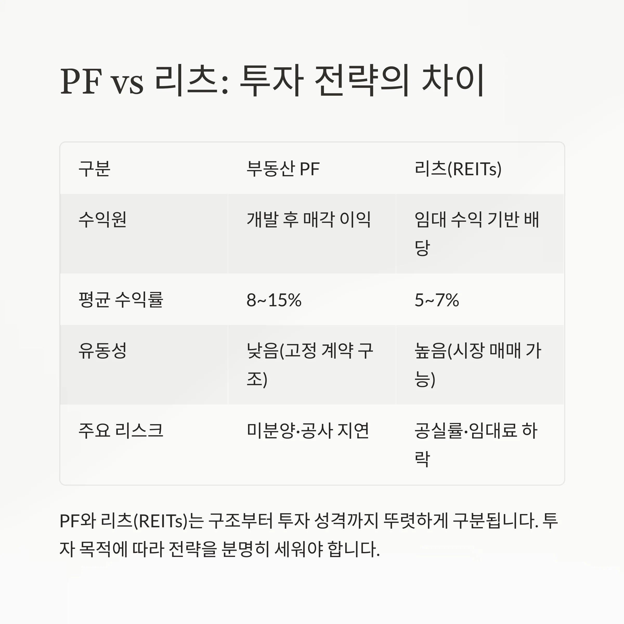 PF와 리츠(REITs)는 구조부터 투자 성격까지 뚜렷하게 구분됩니다.
