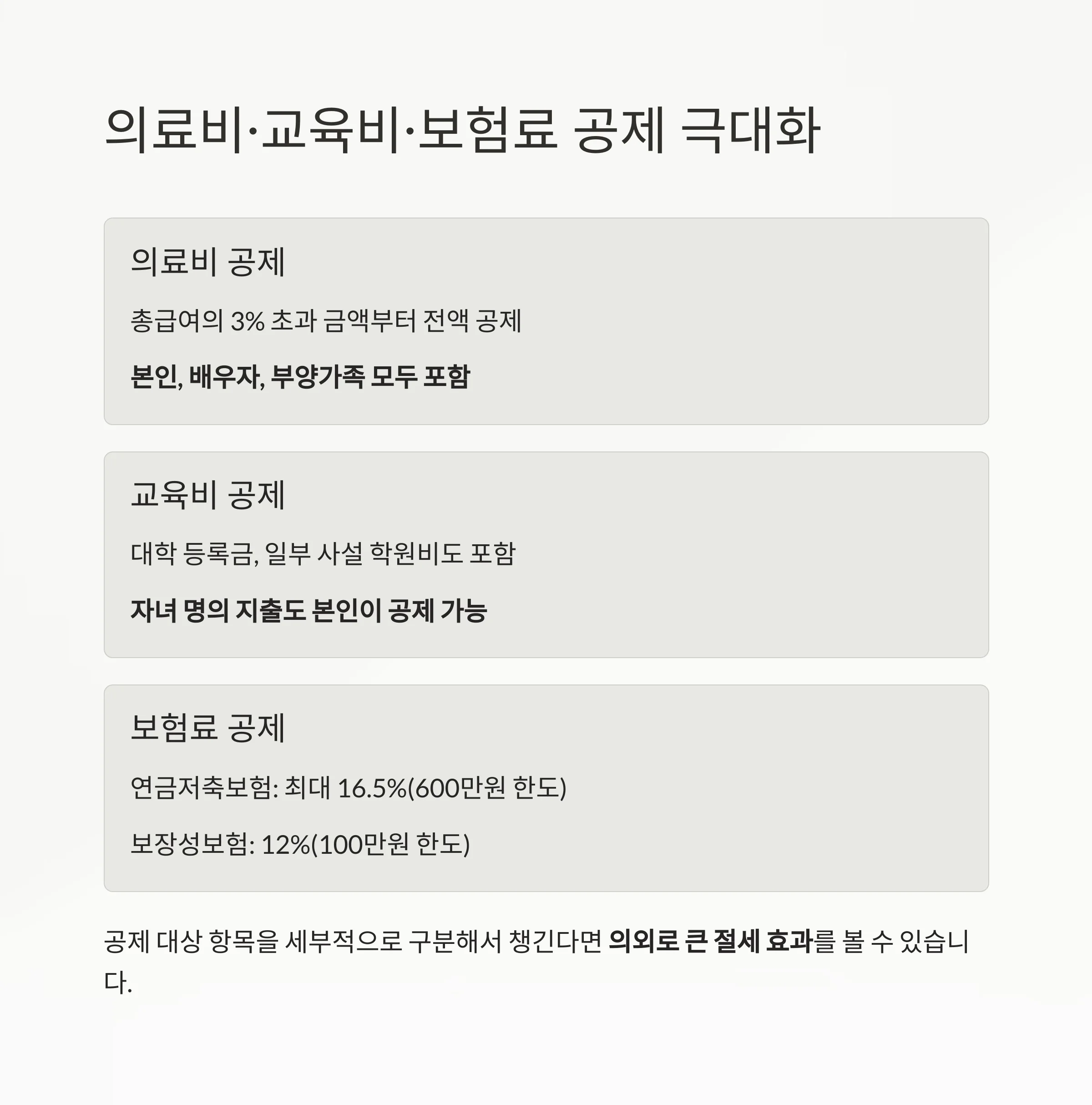 교육비는 대학 등록금뿐 아니라 일부 사설 학원비까지도 공제 대상이며,