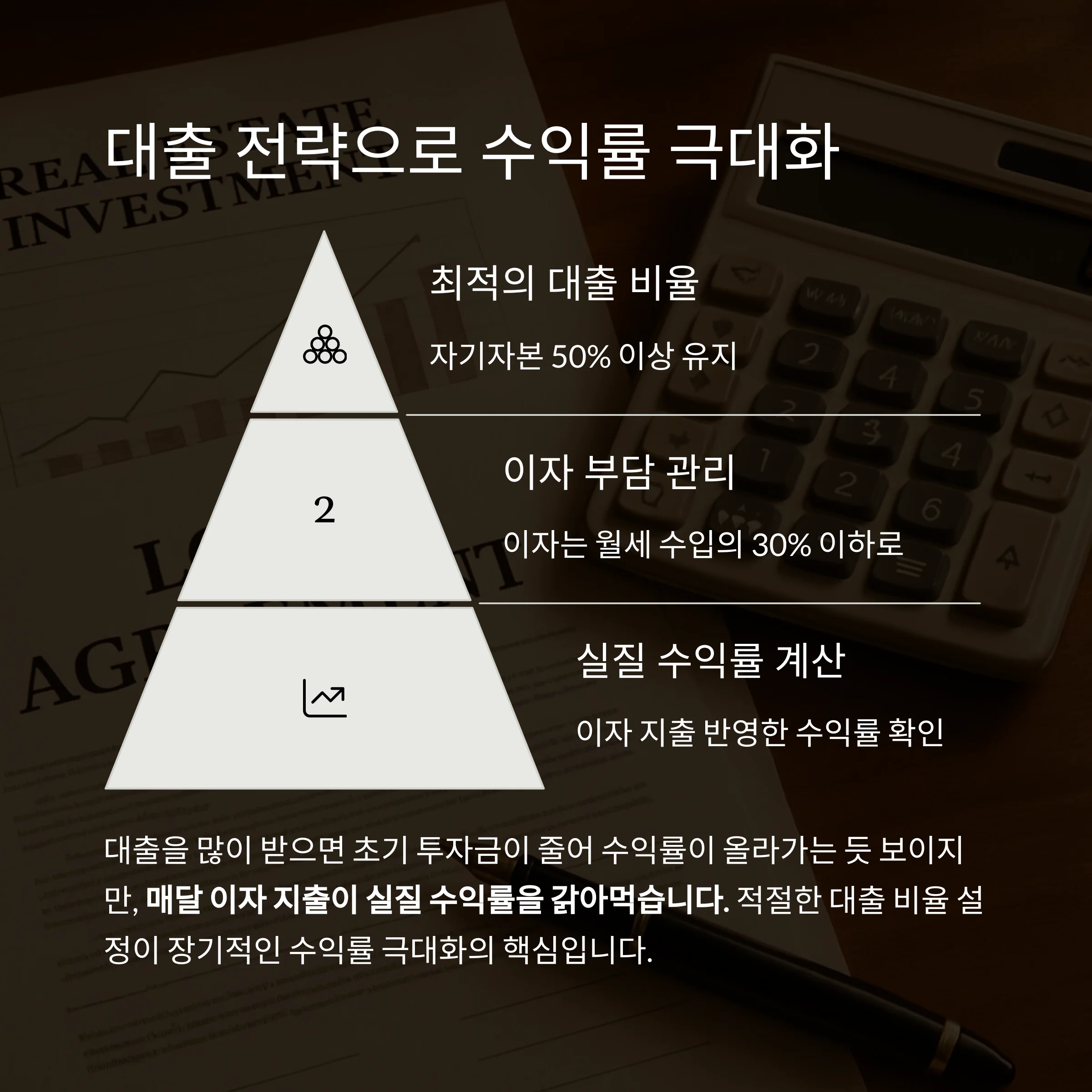 대출을 많이 받으면 초기 투자금이 줄어 수익률이 올라가는 듯 보이지만, 매달 이자 지출이 실질 수익률을 갉아먹습니다.
