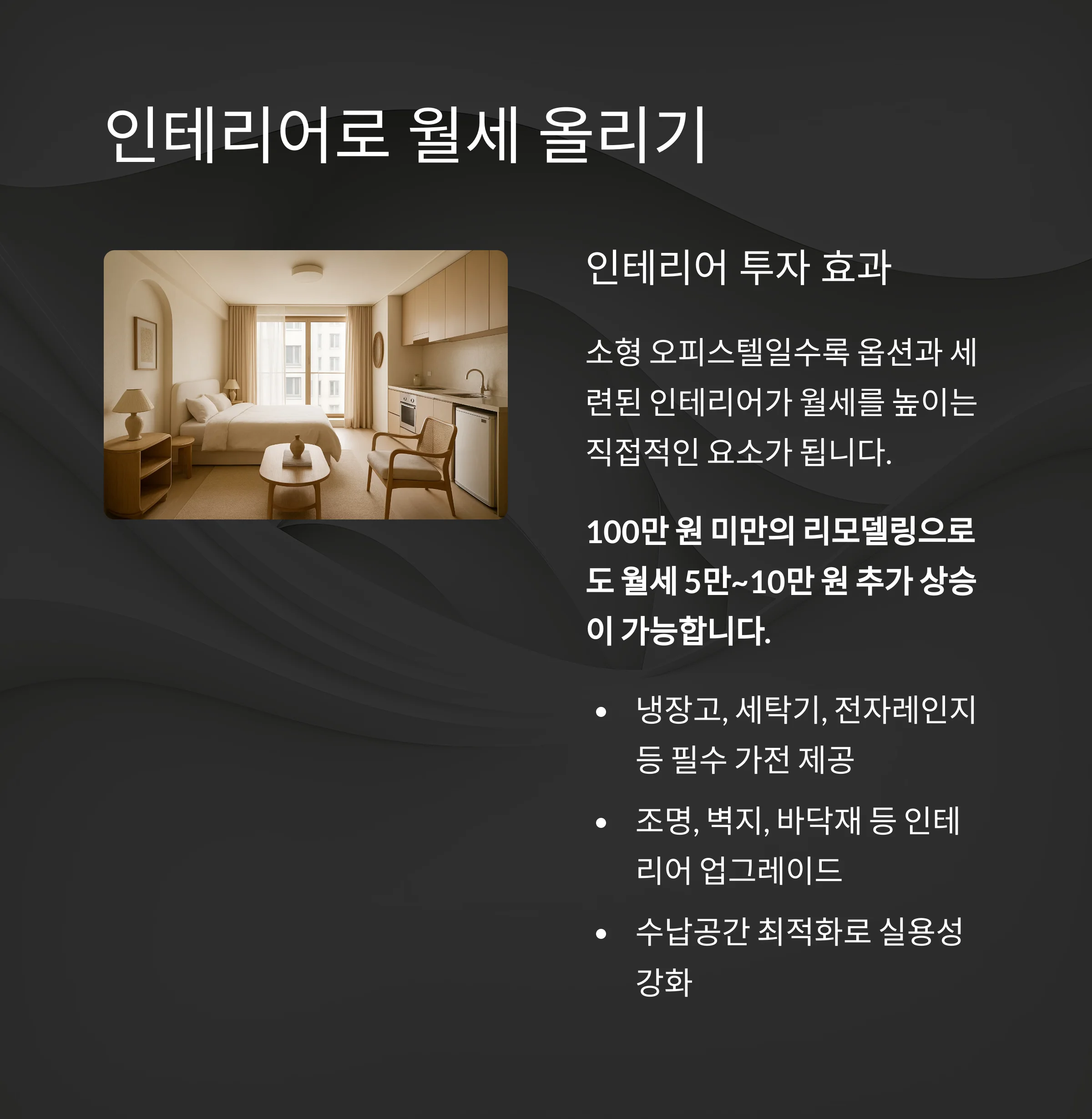 소형 오피스텔일수록 옵션(냉장고, 세탁기, 전자레인지 등)과 세련된 인테리어가 월세를 높이는 직접적인 요소가 됩니다.