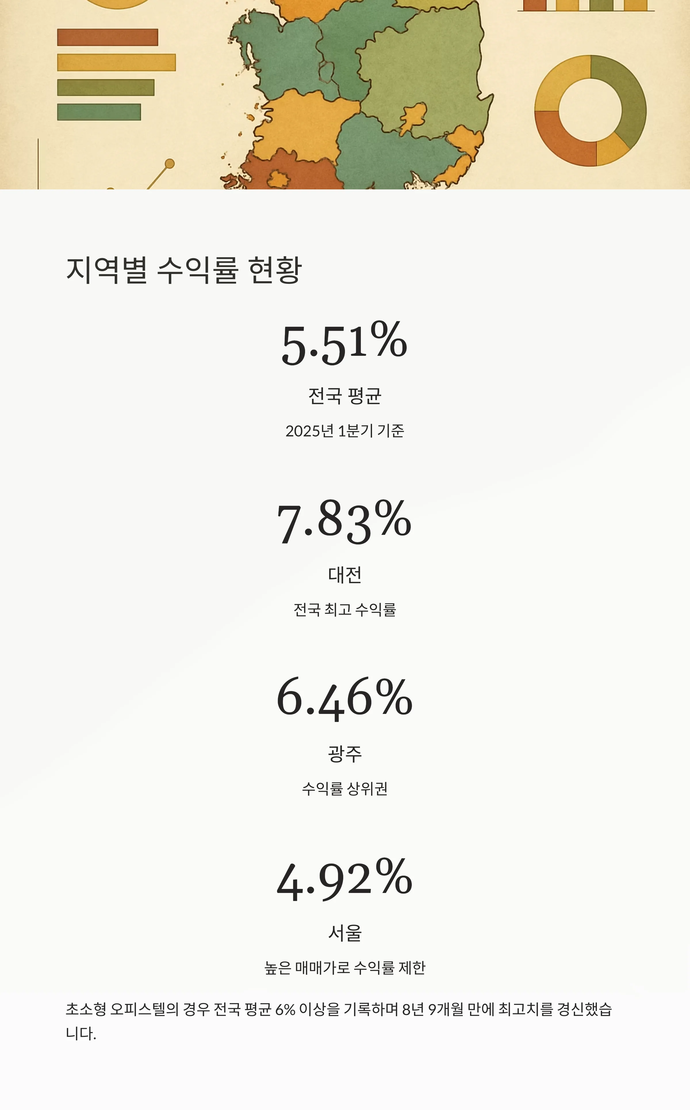 2025년 1분기 기준, 전국 오피스텔 평균 임대 수익률은 **5.51%**로 나타났습니다. 특히 대전(7.83%), 광주(6.46%), 세종(6.40%) 등은 수익률 상위권에 포진하고 있습니다. 반면 서울은 높은 매매가로 인해 평균 **4.92%**에 그쳤습니다.