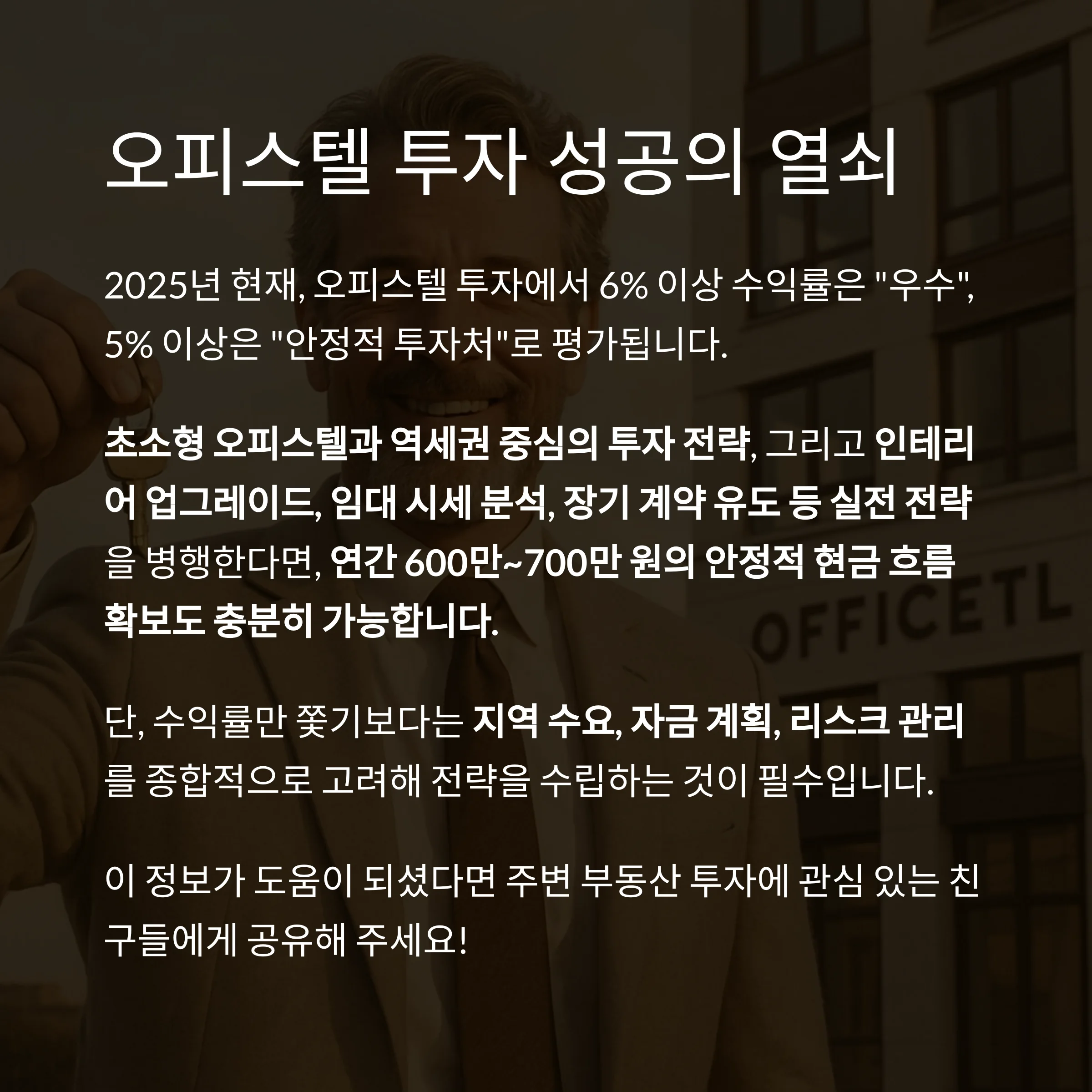 2025년 현재, 오피스텔 투자에서 6% 이상 수익률은 "우수", 5% 이상은 "안정적 투자처"로 평가됩니다.