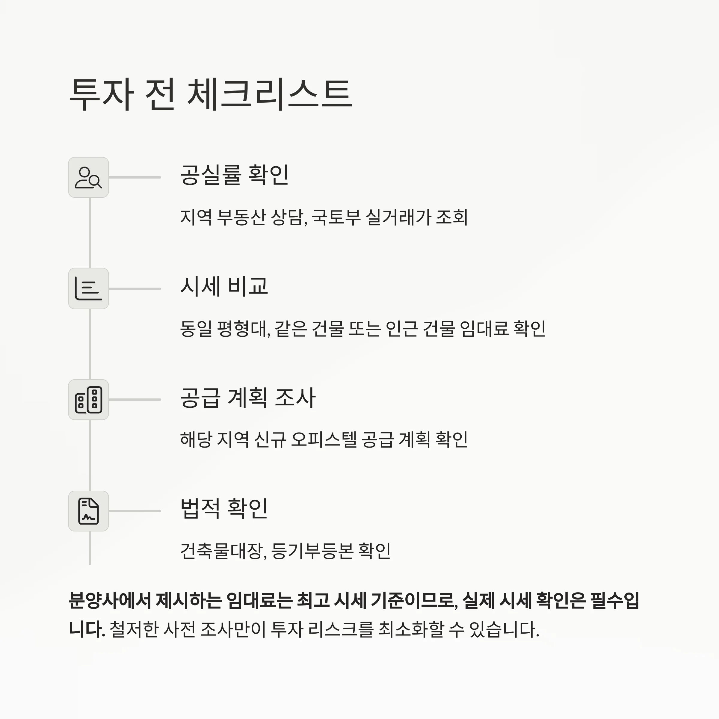 투자 전에는 반드시 해당 지역 공실률, 시세, 향후 공급계획, 법적 문제 등을 철저히 분석해야 합니다.