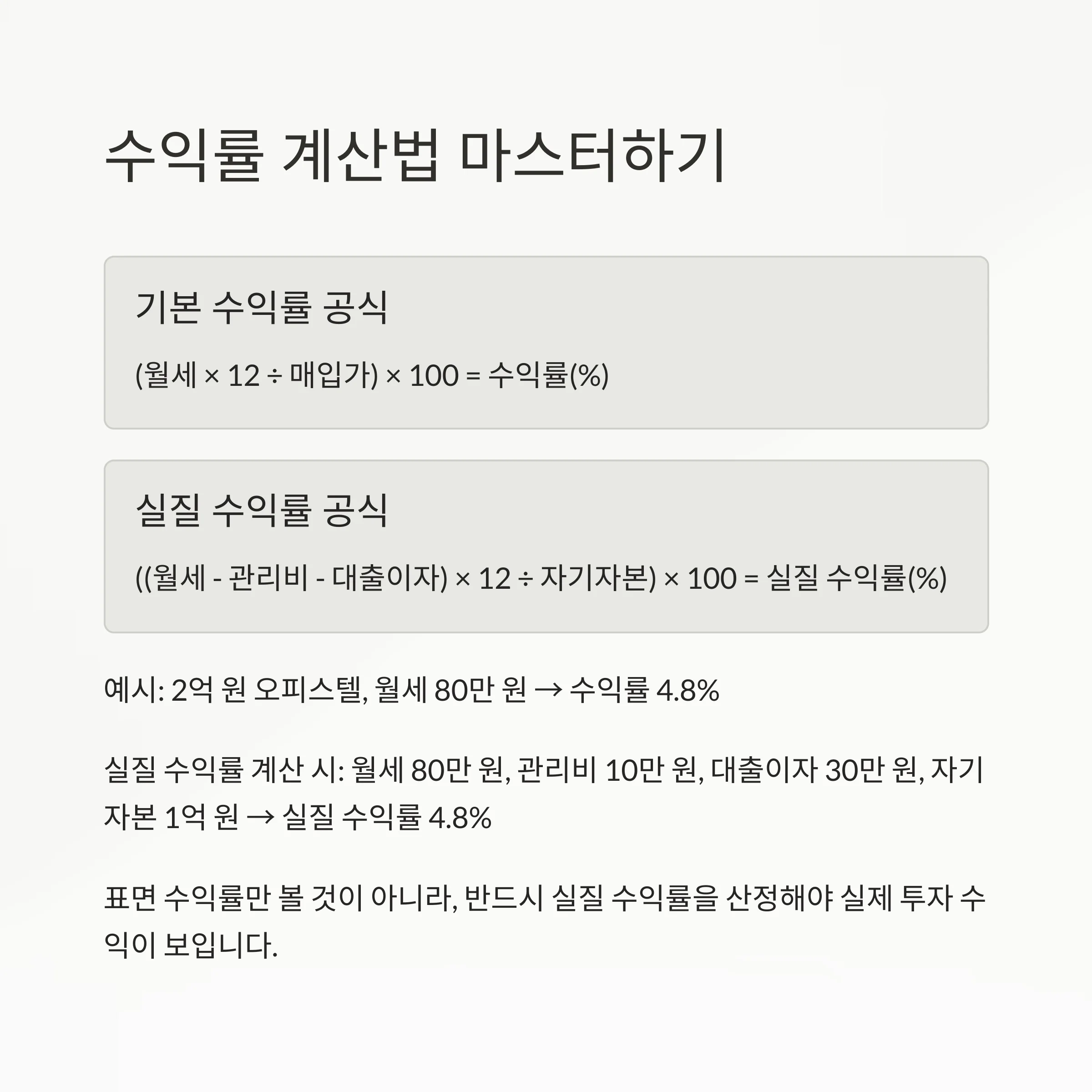 오피스텔 투자 시 가장 먼저 체크해야 할 것은 연 수익률 공식입니다. 아래 예시를 통해 실제 수익률 계산이 어떻게 이루어지는지 살펴보겠습니다.