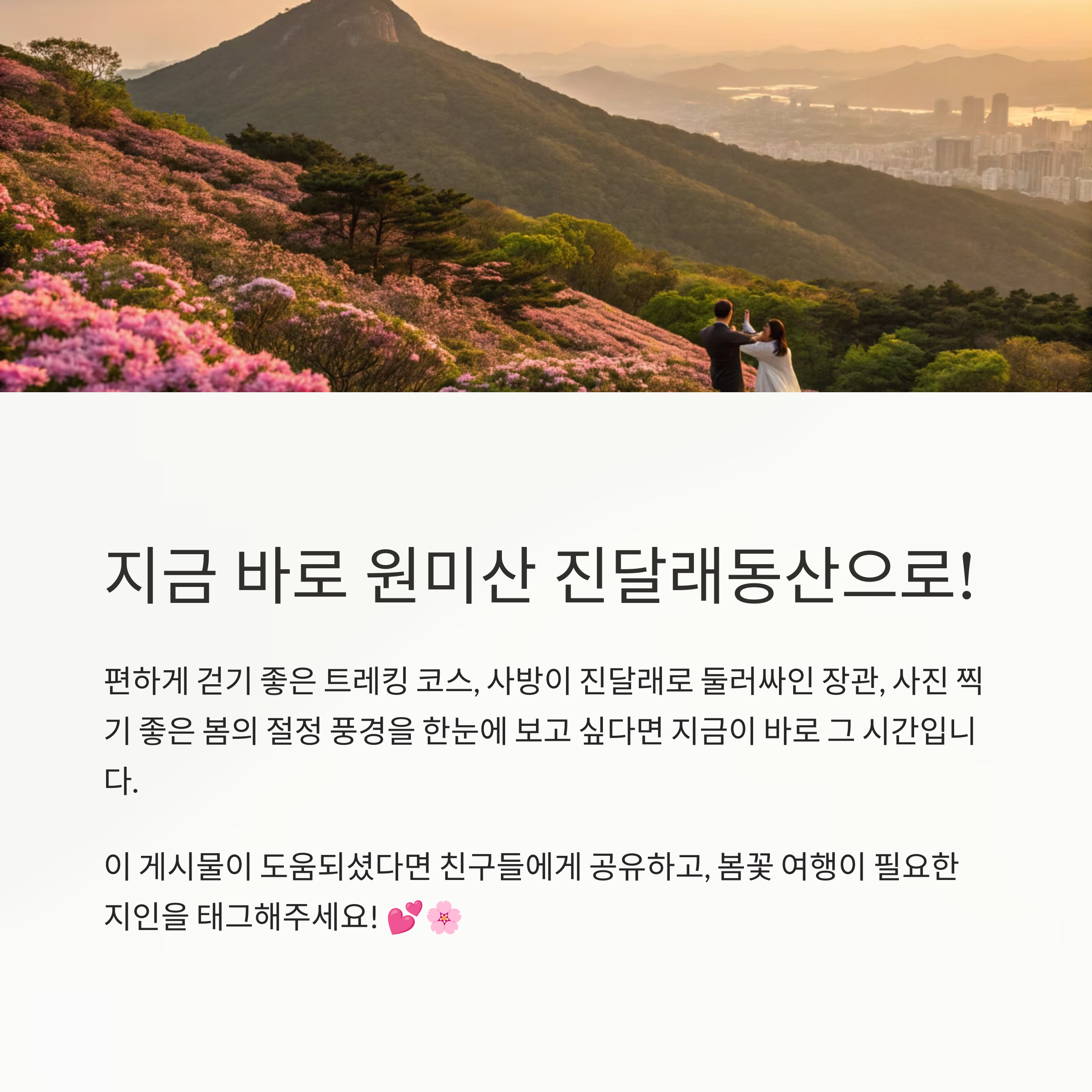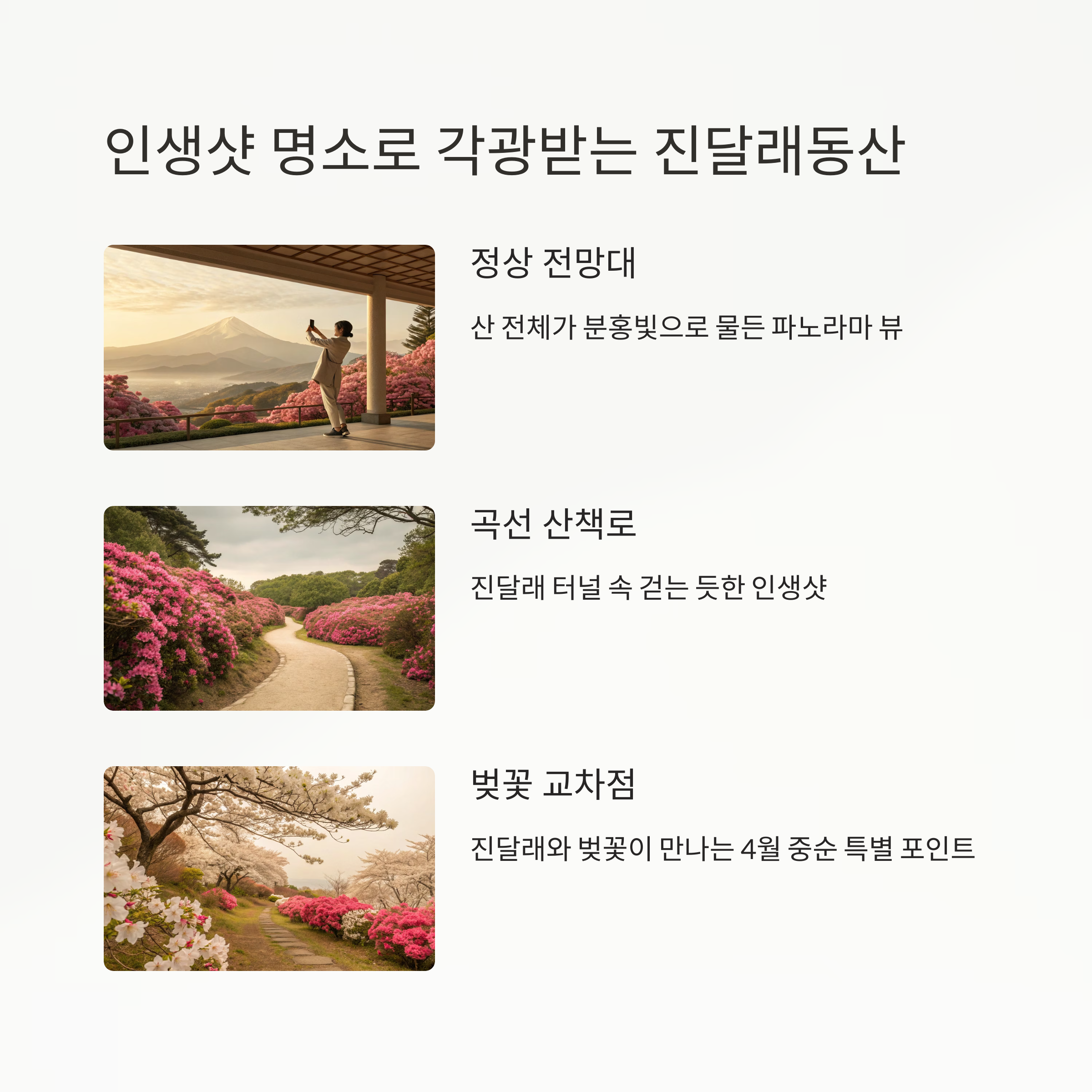 특히 진달래와 벚꽃이 겹치는 4월 중순은 인생샷 포인트로 각광받고 있습니다.