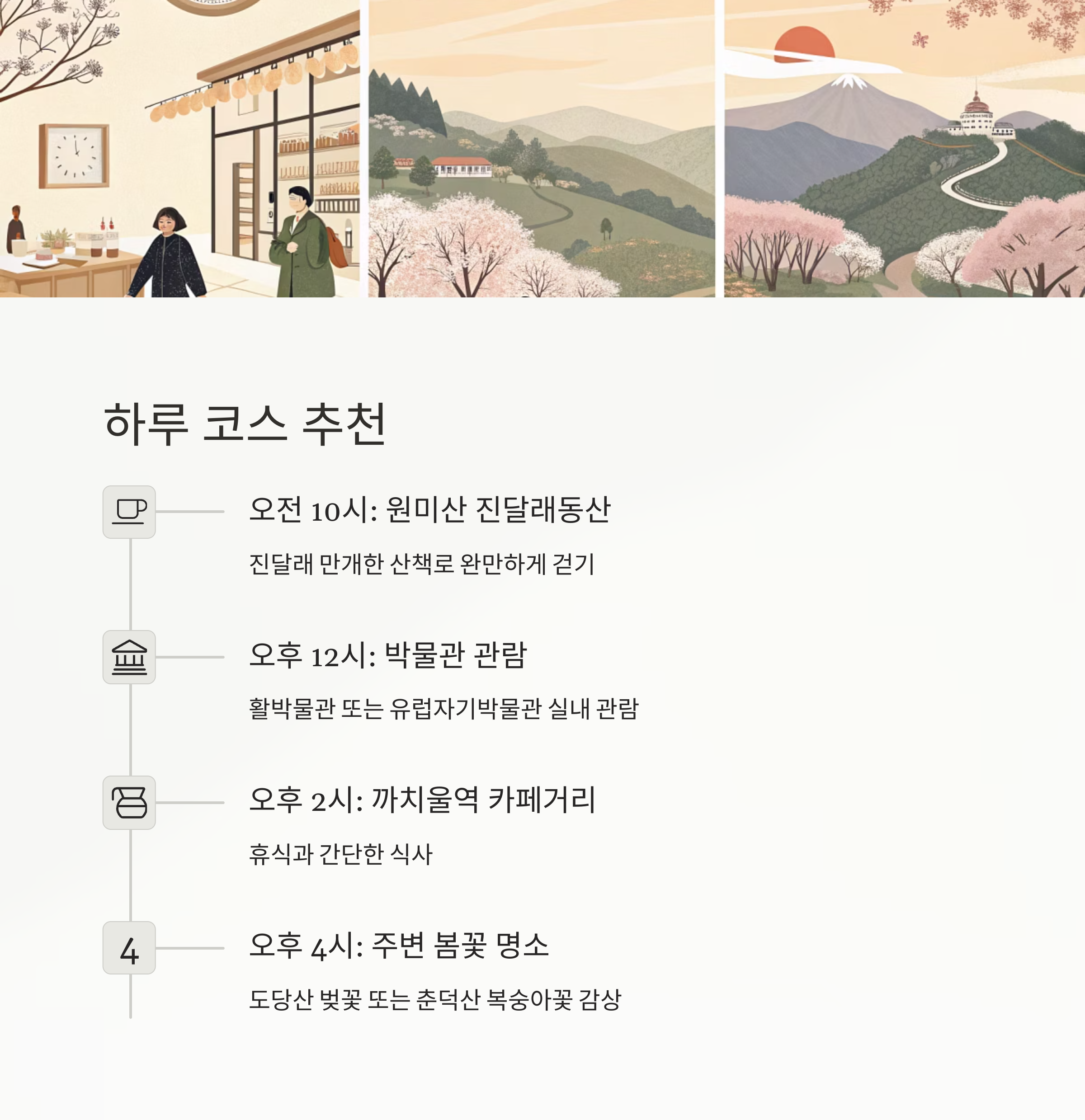 | 오후 4시 | 도당산 벚꽃 or 춘덕산 복숭아꽃 | 봄꽃 연계 관람, 사진 명소 |