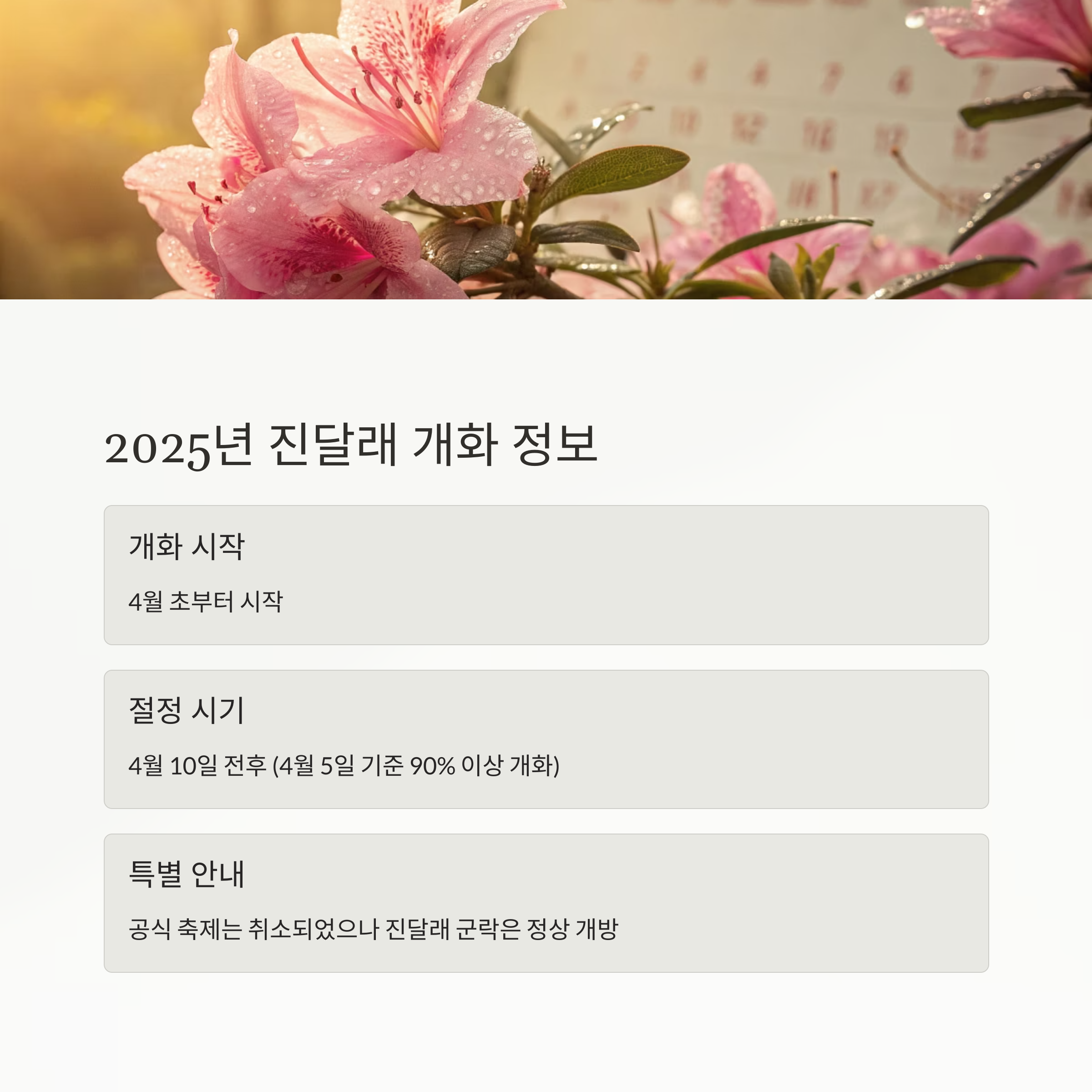 2025년 기준 진달래는 4월 초 개화를 시작해 4월 5일엔 90% 이상 만개한 상태를 보였습니다.