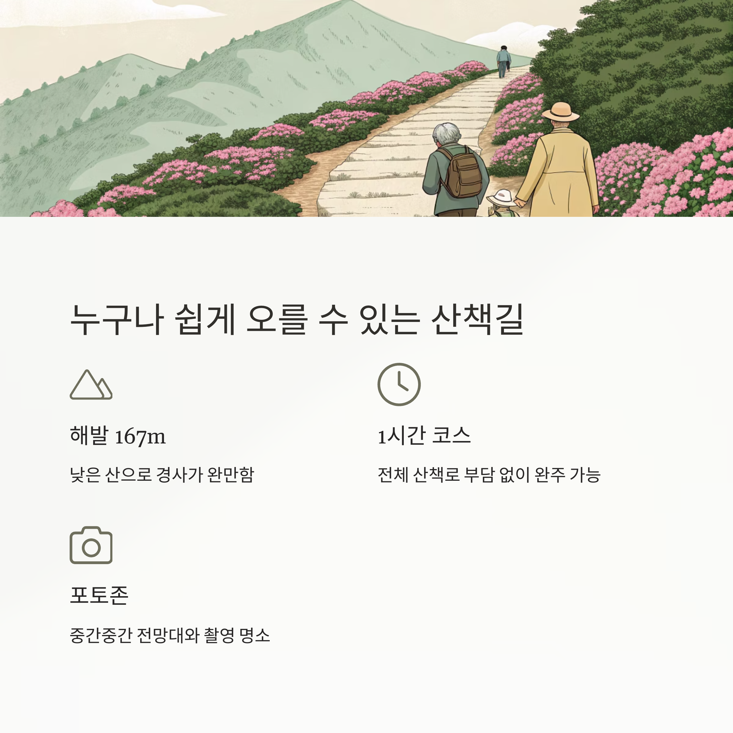 특히 진달래가 활짝 핀 산책로는 유모차 이동도 가능한 구간이 많아 유아 동반 방문에도 용이합니다.