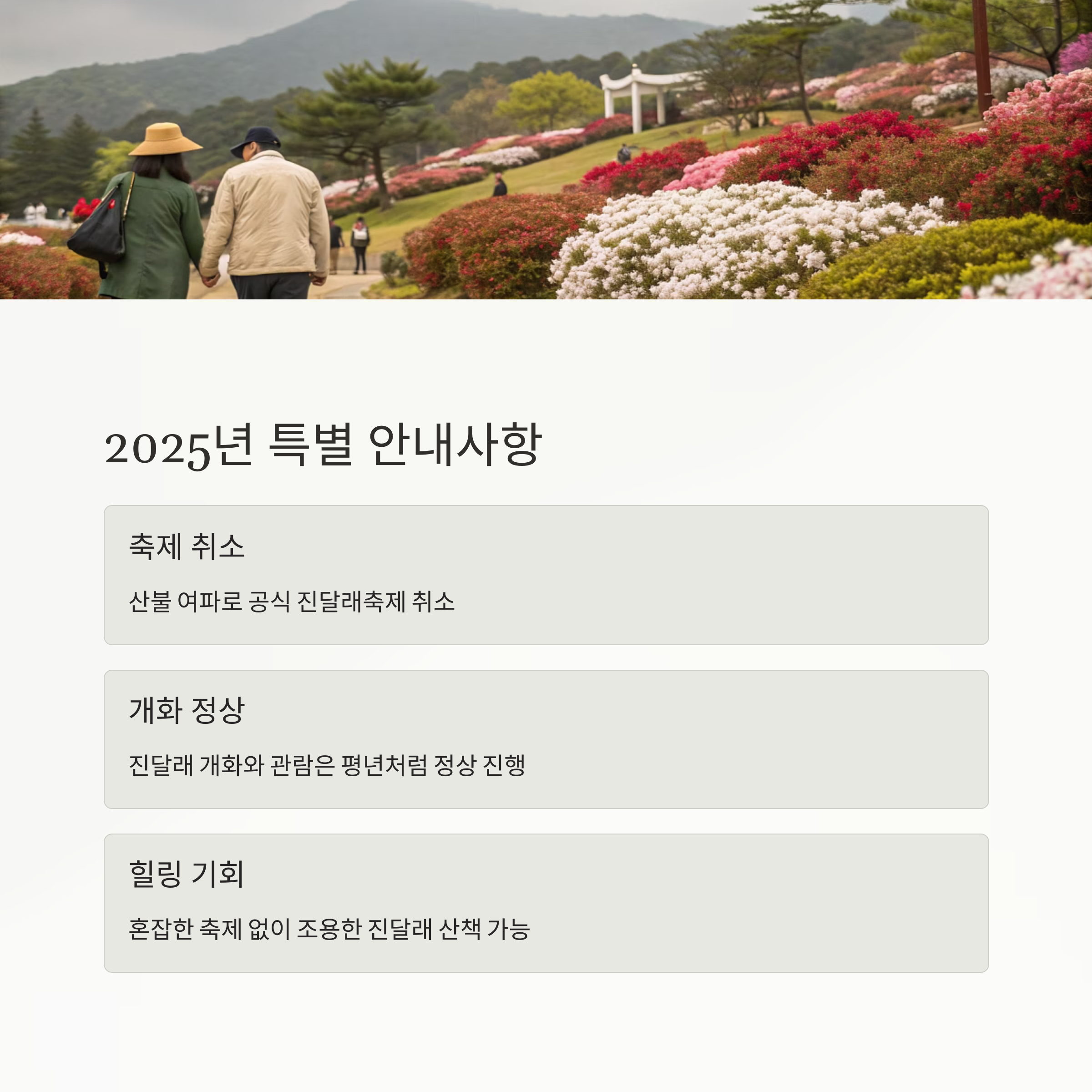 올해는 산불 여파로 공식 축제는 취소되었지만, 진달래 군락은 여전히 정상적으로 개방되어