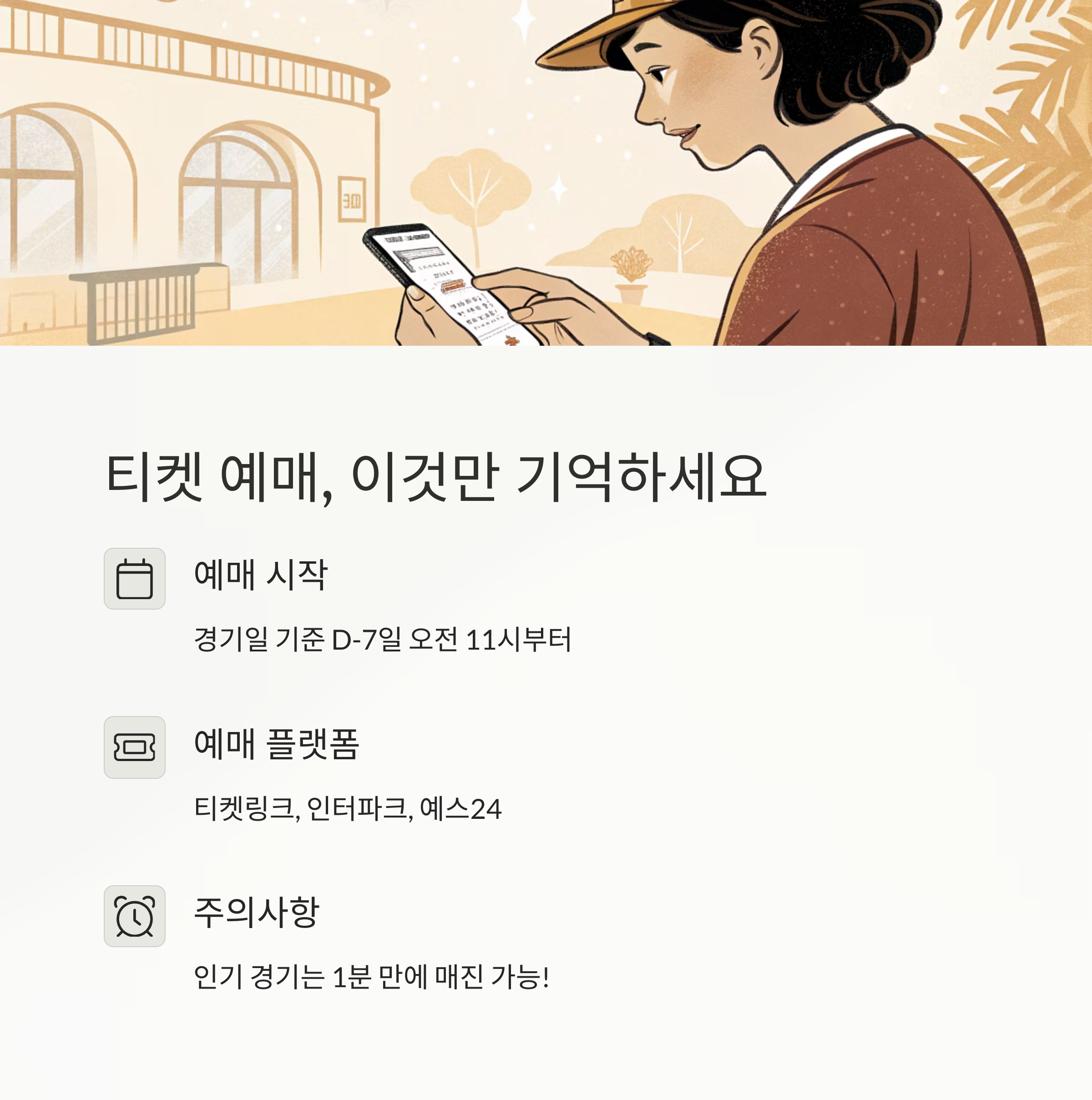 "인기 팀 경기는 오픈 1분 만에 매진될 수 있으니, 예매 시작 시간 알람은 필수입니다!"
