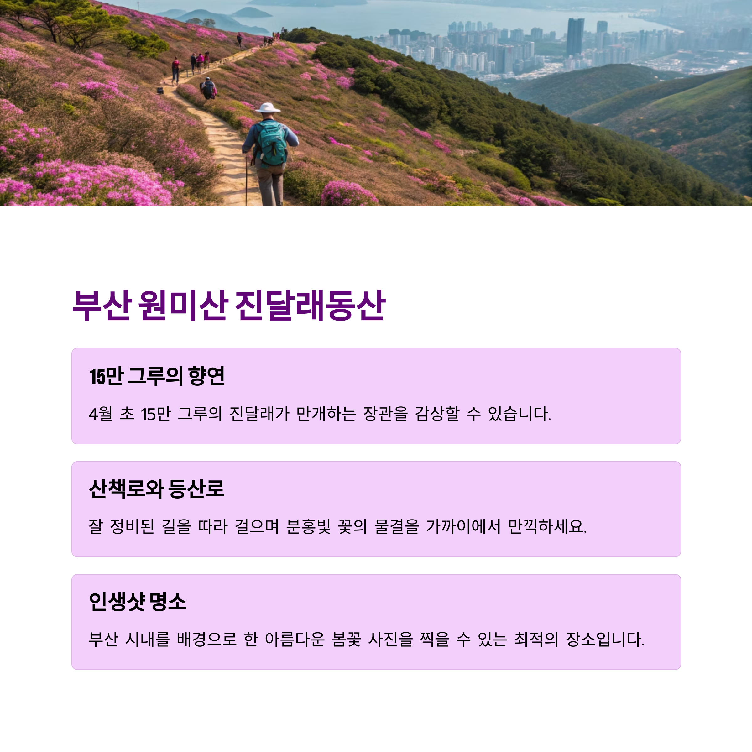 부산 원미산은 한적한 분위기 속에 진달래가 물든 풍경이 인상적입니다.