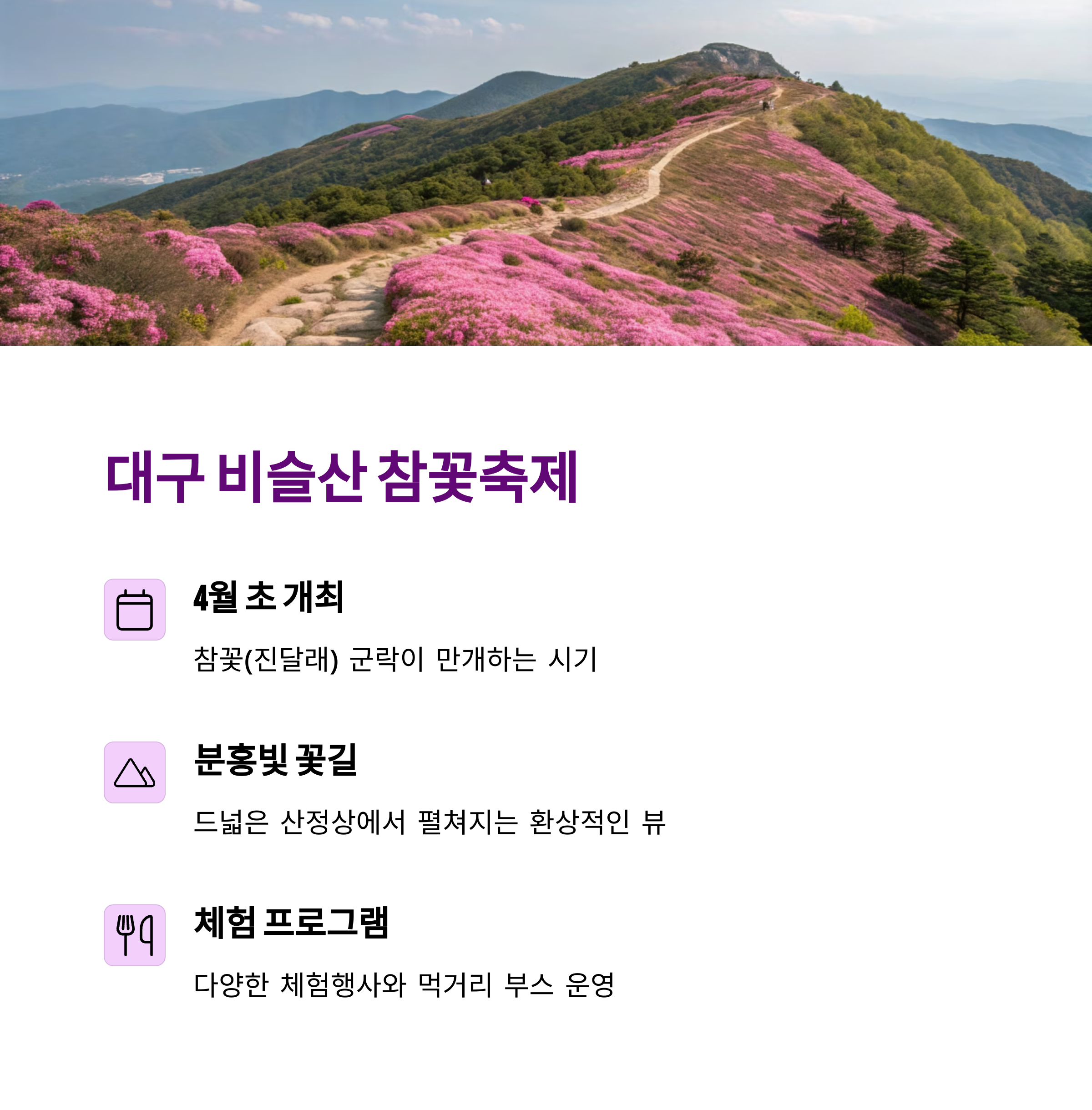 | 비슬산 참꽃축제 (대구) | 참꽃, 4월 초~중순 |