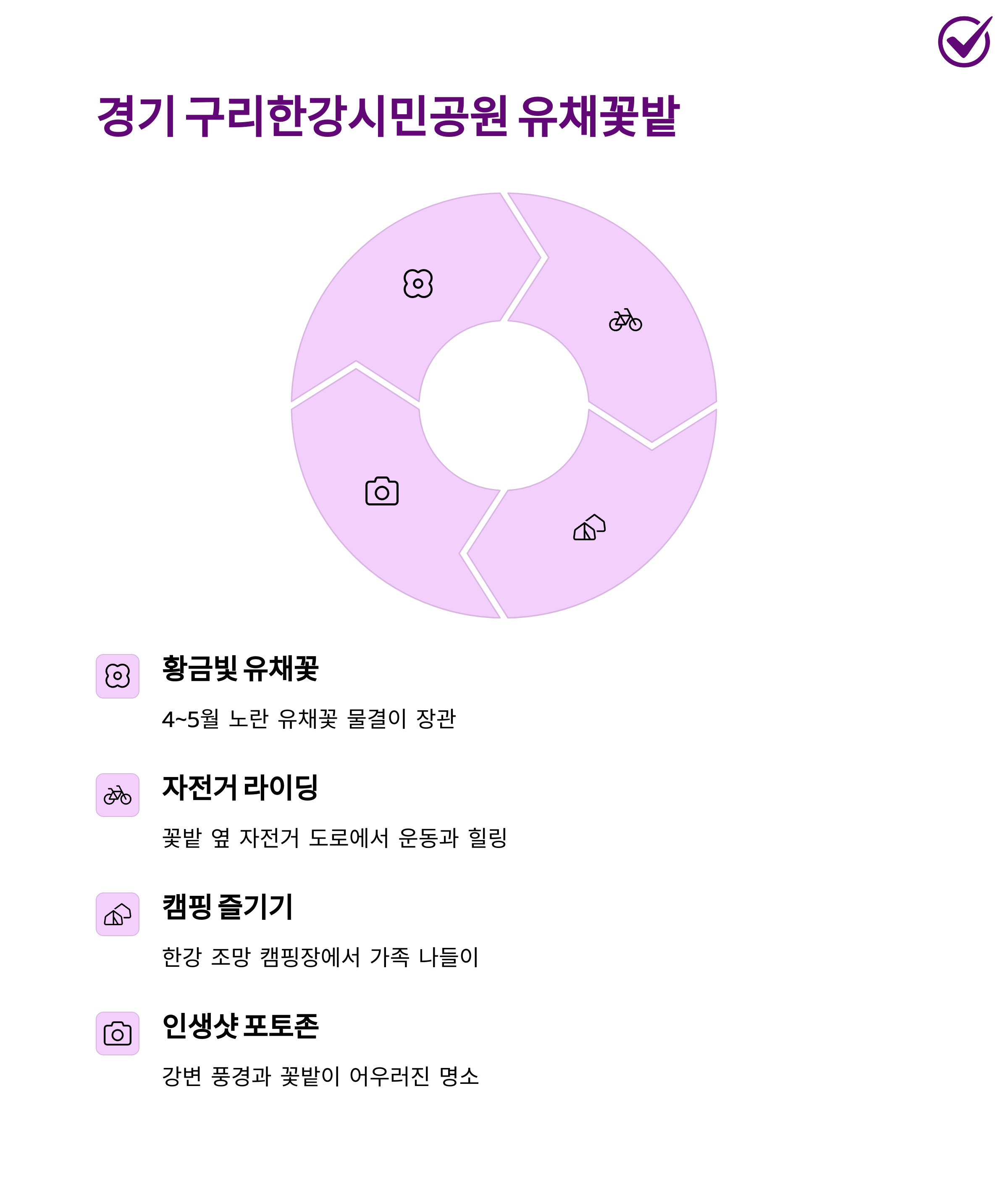 한편, 구리 한강시민공원의 유채꽃밭은 가족 나들이를 위한 최적의 장소로 손꼽히죠.